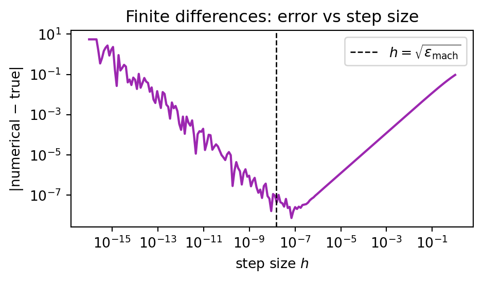 title="Finite differences: error vs step size")