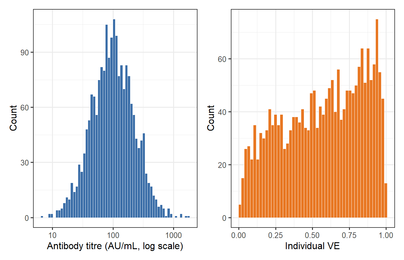 where $\text{EC}_{50}$ is the titre at 50% protection and $k$ is a Hill coefficient. We can propagate this through a two-arm SIR model (vaccinated arm with heterogeneous VE, placebo arm) to simulate an attack-rate trial.
