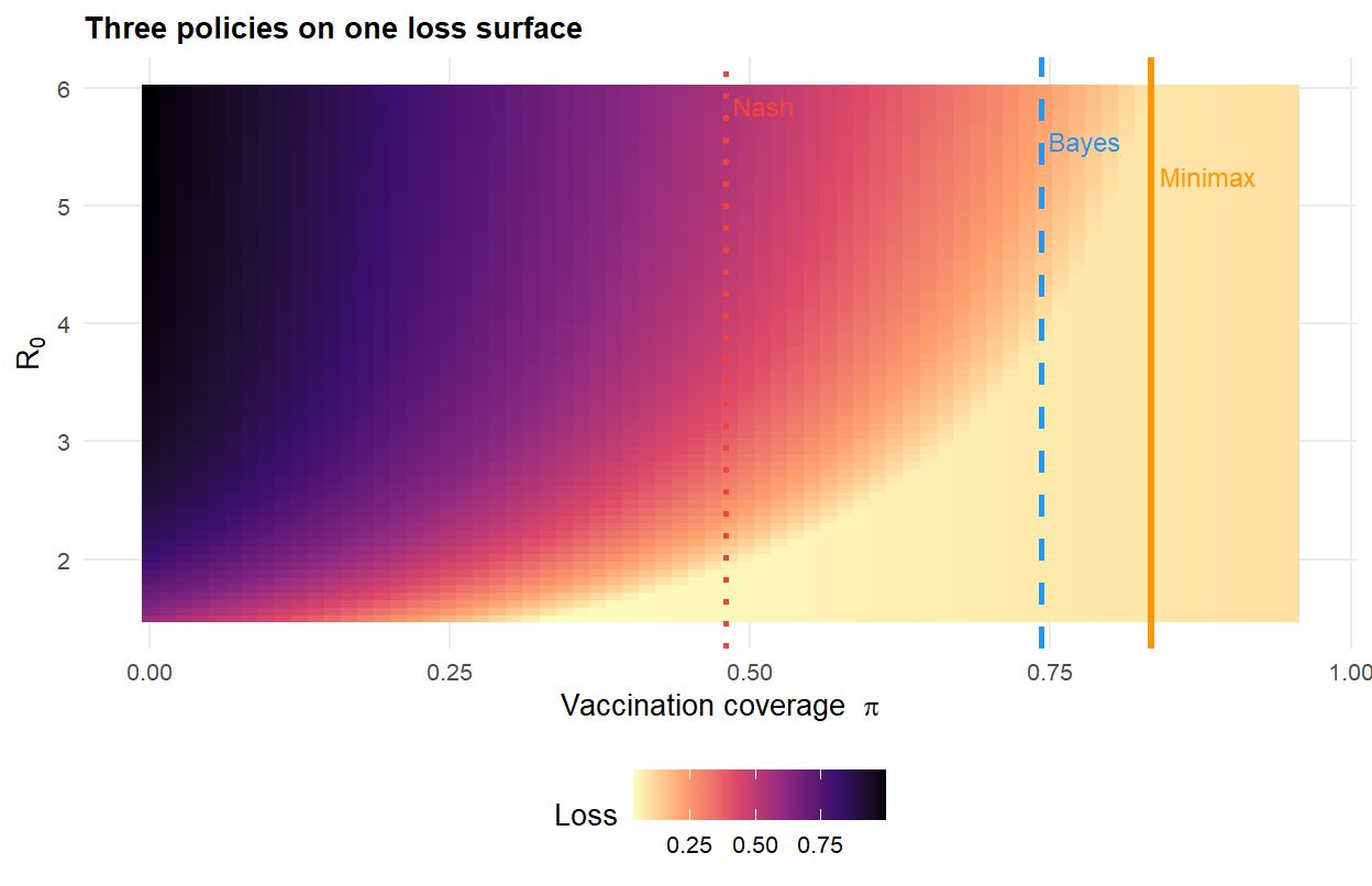#| fig-cap: "Planner's loss as a function of coverage $\\pi$ and $R_0$, with three candidate policies overlaid. The minimax policy is pinned to the worst-case $R_0 = 6$; the Bayes policy responds to the full prior; the Nash coverage ignores the externality entirely."