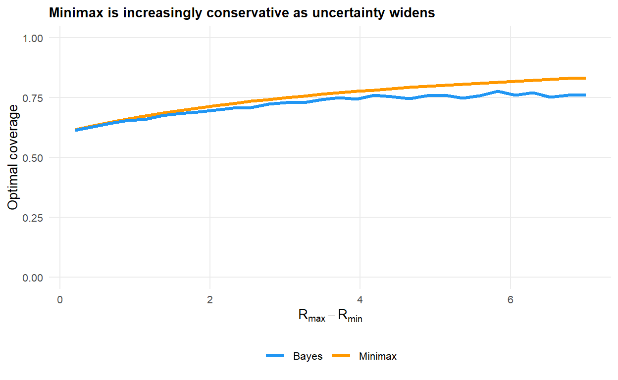 #| fig-cap: "Optimal coverage as a function of the width of the uncertainty set, centred on $R_0 = 2.5$. The minimax policy scales with the upper bound of the set; the Bayes policy is largely driven by the mean."