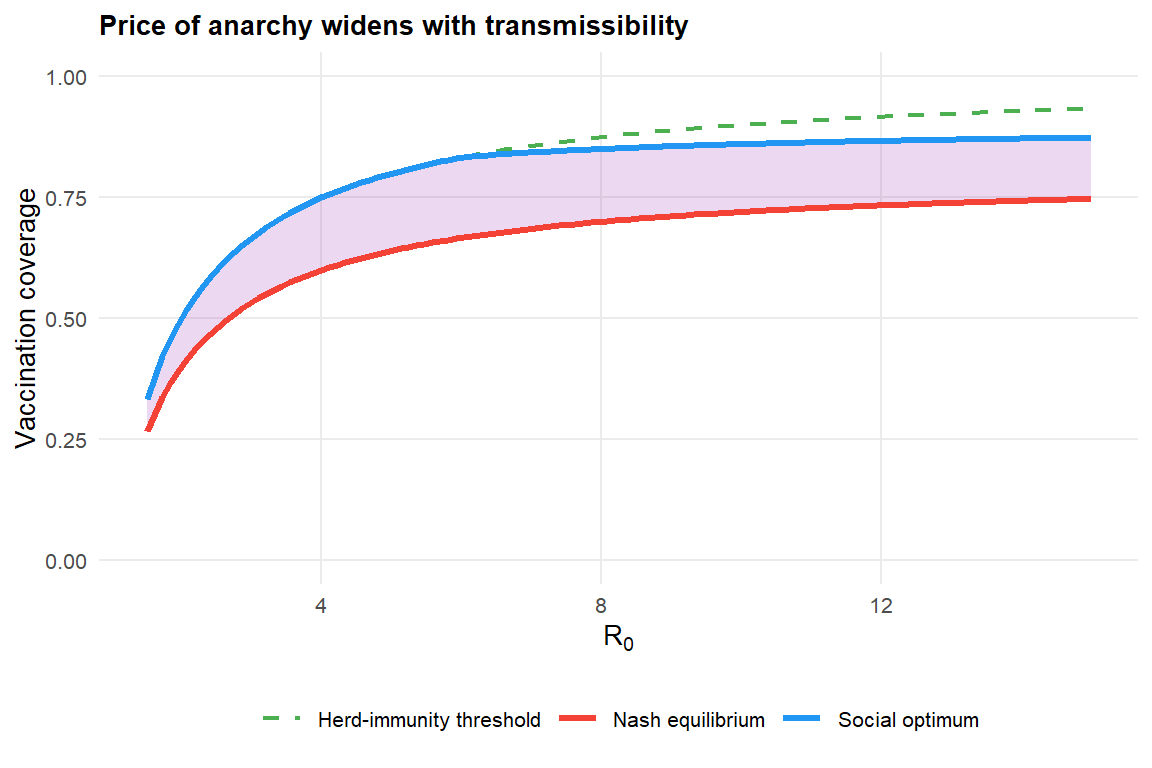 2. **The price of anarchy is not monotone.** It is small for low-$R_0$ pathogens (where vaccination is unnecessary) and for very high-$R_0$ ones (where individuals vaccinate anyway because infection is nearly certain). It peaks at intermediate transmissibility — exactly the regime most common in practice.