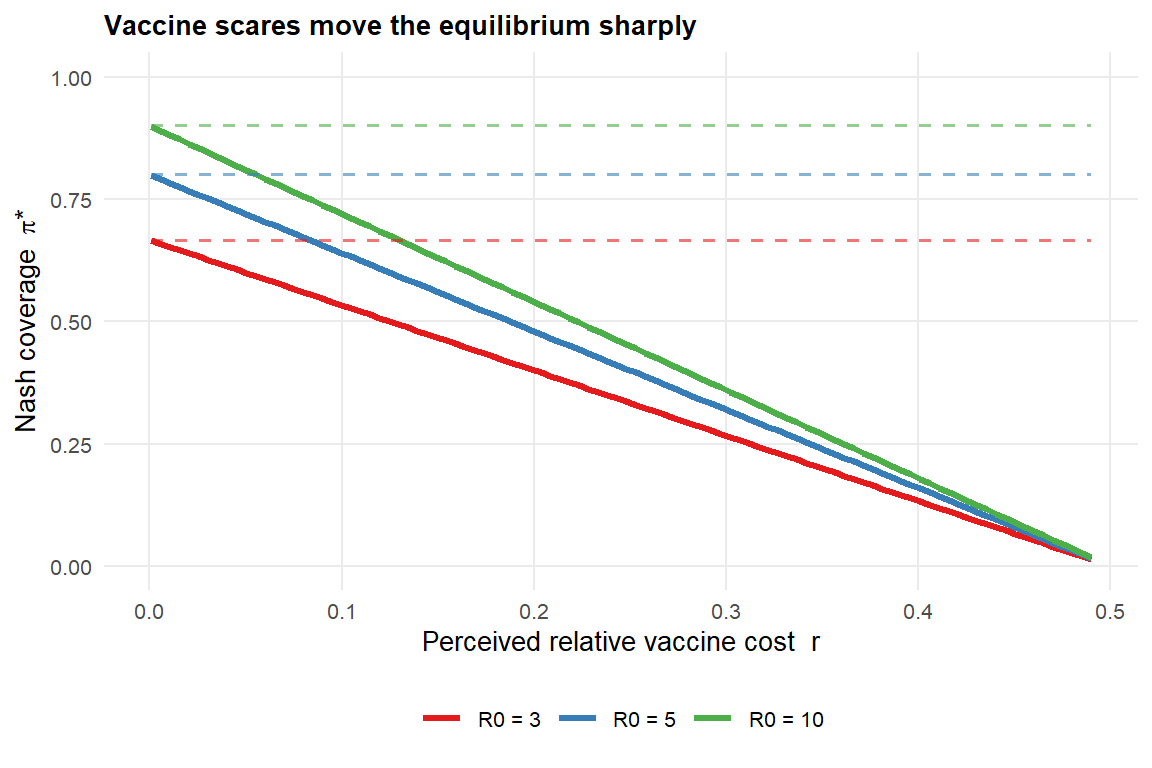 - Equilibrium coverage is **highly sensitive** to $r$ near zero. A modest increase in perceived cost (a scare) can cause a large drop in uptake.
