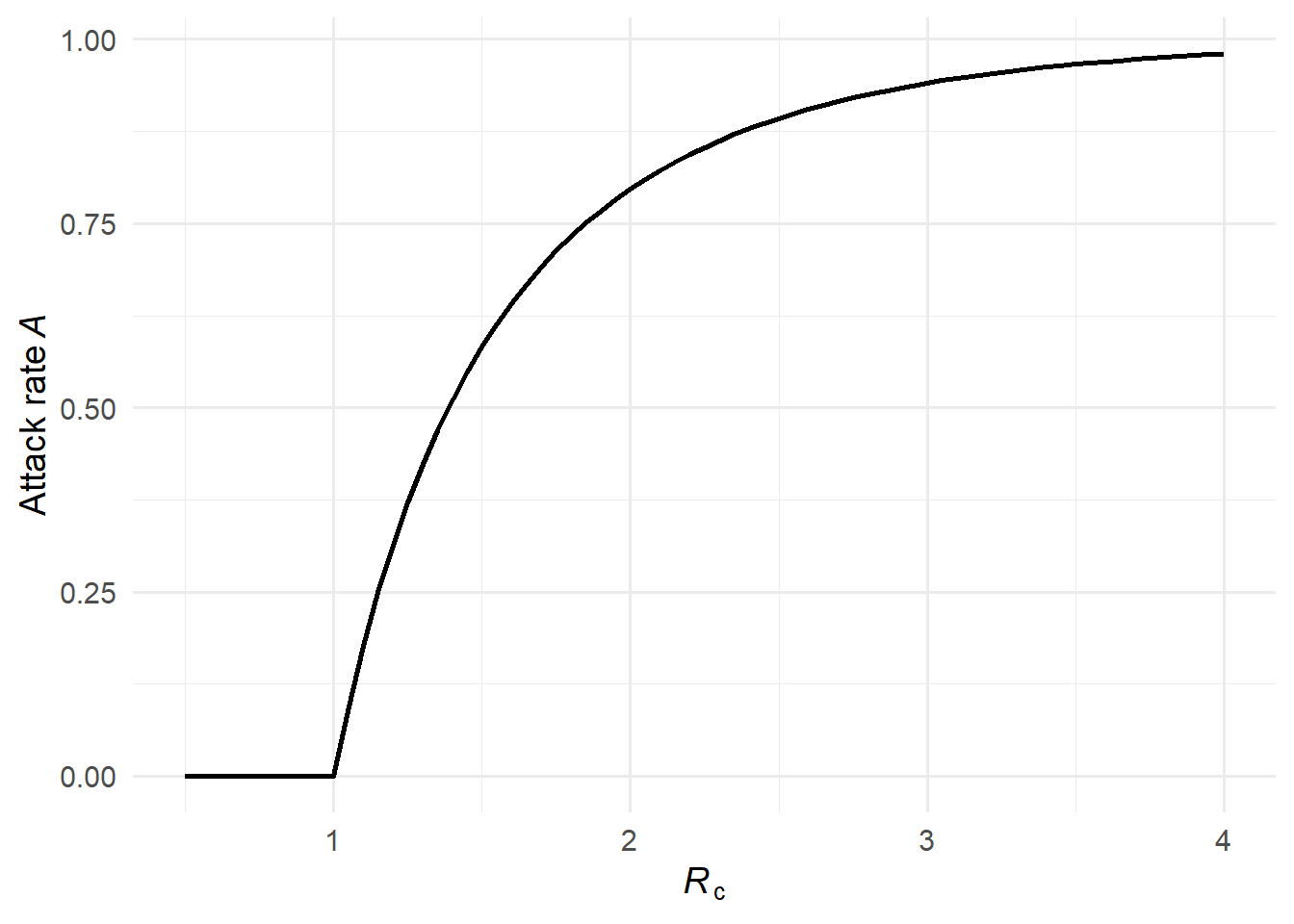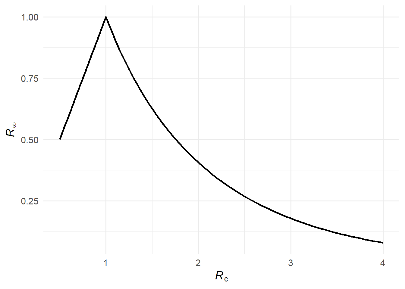 Formally, this is reflected in \(\mathcal{R}_\infty\) becoming small when \(\mathcal{R}_c\) is large: a large epidemic infects almost everyone (\(\mathcal{A} \approx 1\)), leaving few susceptibles at the end, so \(\mathcal{R}_\infty = (1 - \mathcal{A})\mathcal{R}_c \approx 0\) and \(\mathcal{F}(\mathcal{R}_c) \approx 0\).