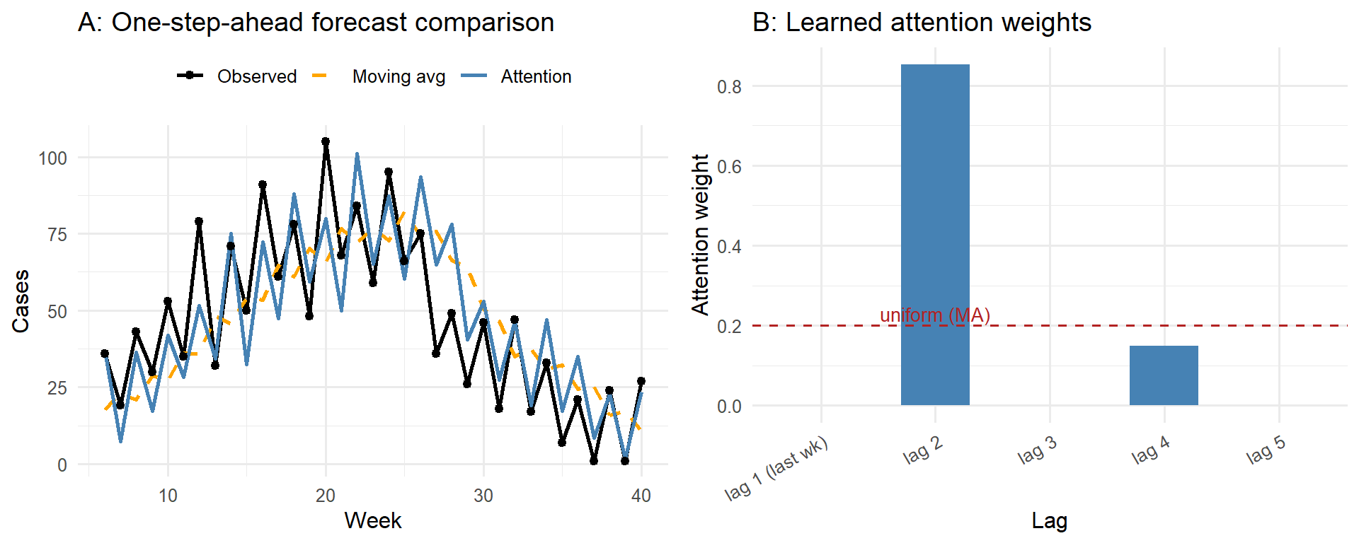 Left: one-step-ahead forecasts. Attention (blue) tracks the epidemic curve more closely than the moving average (orange) by learning non-uniform lag weights. Right: learned attention weights. Lags 2 and 4 (the even lags, in-phase with the 2-week cycle) receive all the weight; lags 1, 3, and 5 (out-of-phase) receive zero. A fixed moving average wastes weight on the out-of-phase lags and is therefore a worse predictor.