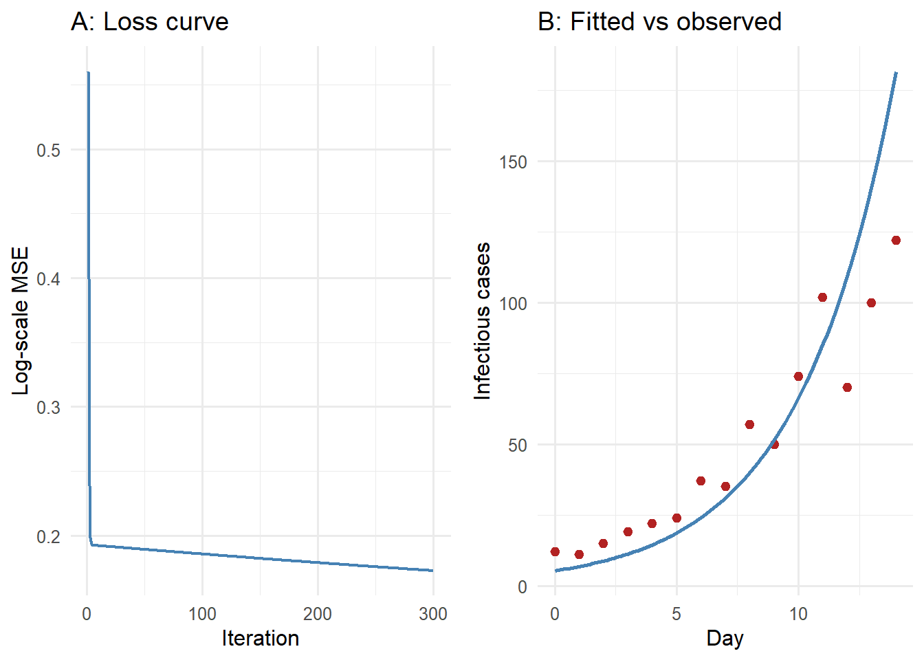 library(ggplot2)# Panel A: loss curvep_loss <-ggplot(history, aes(x = iter, y = loss)) +geom_line(colour ="steelblue", linewidth =0.8) +labs(x ="Iteration", y ="Log-scale MSE",title ="A: Loss curve") +theme_minimal(base_size =12)# Panel B: fitted vs observedt_fine <-seq(0, 14, length.out =100)I_fit <- params["I0"] *exp(params["r"] * t_fine)df_obs <-data.frame(t = t_obs, cases = I_obs)df_fit <-data.frame(t = t_fine, cases = I_fit)p_fit <-ggplot() +geom_point(data = df_obs, aes(x = t, y = cases),colour ="firebrick", size =2) +geom_line(data = df_fit, aes(x = t, y = cases),colour ="steelblue", linewidth =1) +labs(x ="Day", y ="Infectious cases",title ="B: Fitted vs observed") +theme_minimal(base_size =12)# Side by side with base R layoutgridExtra_available <-requireNamespace("gridExtra", quietly =TRUE)if (gridExtra_available) { gridExtra::grid.arrange(p_loss, p_fit, ncol =2)} else {print(p_loss)print(p_fit)}