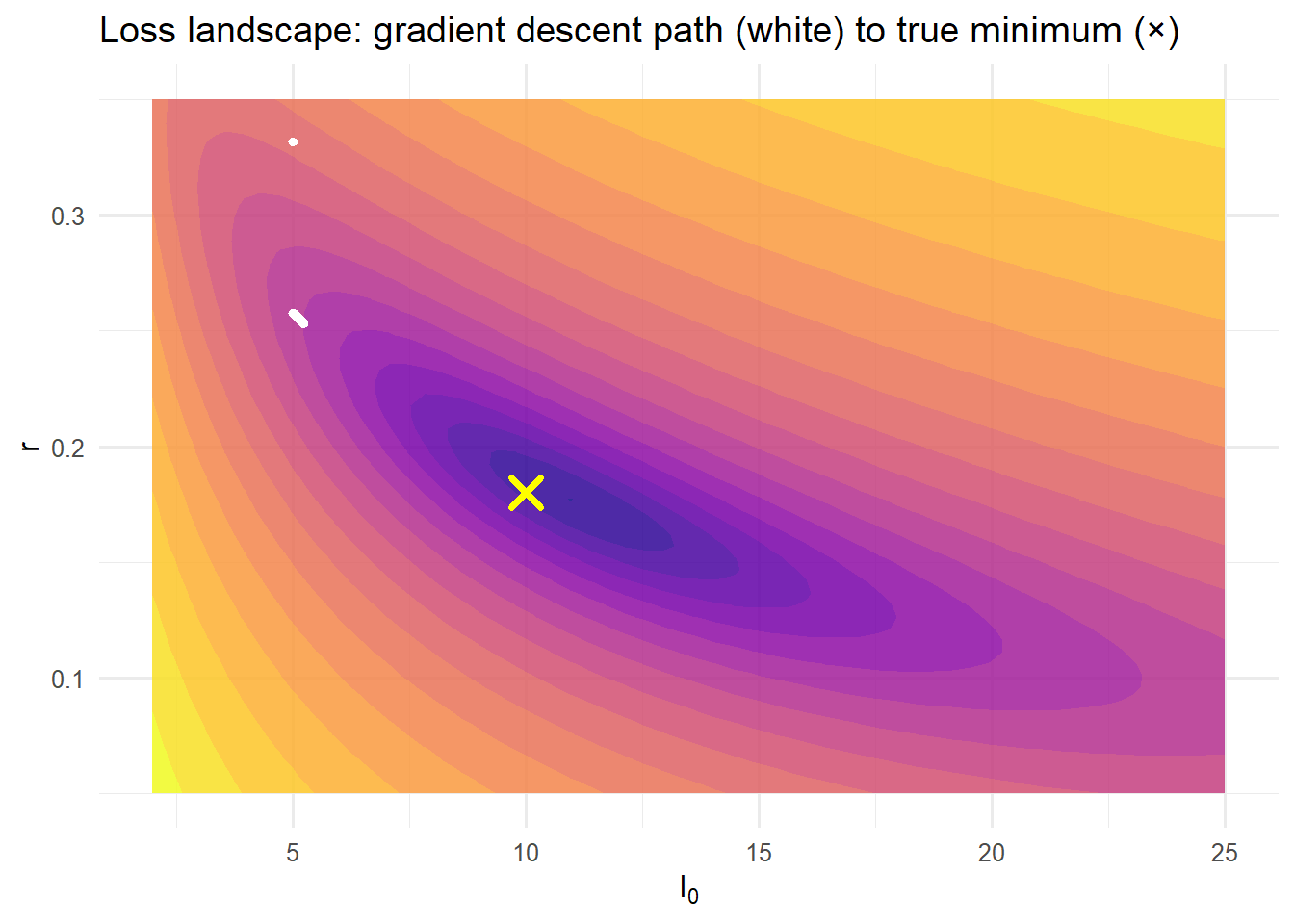 # Compute loss on a gridI0_grid <-seq(2, 25, length.out =60)r_grid <-seq(0.05, 0.35, length.out =60)grid_df <-expand.grid(I0 = I0_grid, r = r_grid)grid_df$loss <-vapply(seq_len(nrow(grid_df)),function(i) loss(c(grid_df$I0[i], grid_df$r[i])),numeric(1))# Subsample path for readabilitypath_sub <- history[seq(1, n_iter, by =10), ]ggplot(grid_df, aes(x = I0, y = r, z =log(loss +1e-6))) +geom_contour_filled(bins =20, alpha =0.85) +geom_point(data = path_sub, aes(x = I0, y = r, z =NULL),colour ="white", size =1.2) +geom_point(aes(x = I0_true, y = r_true, z =NULL),colour ="yellow", shape =4, size =4, stroke =2) +scale_fill_viridis_d(option ="plasma", guide ="none") +labs(x =expression(I[0]), y ="r",title ="Loss landscape: gradient descent path (white) to true minimum (×)") +theme_minimal(base_size =12)