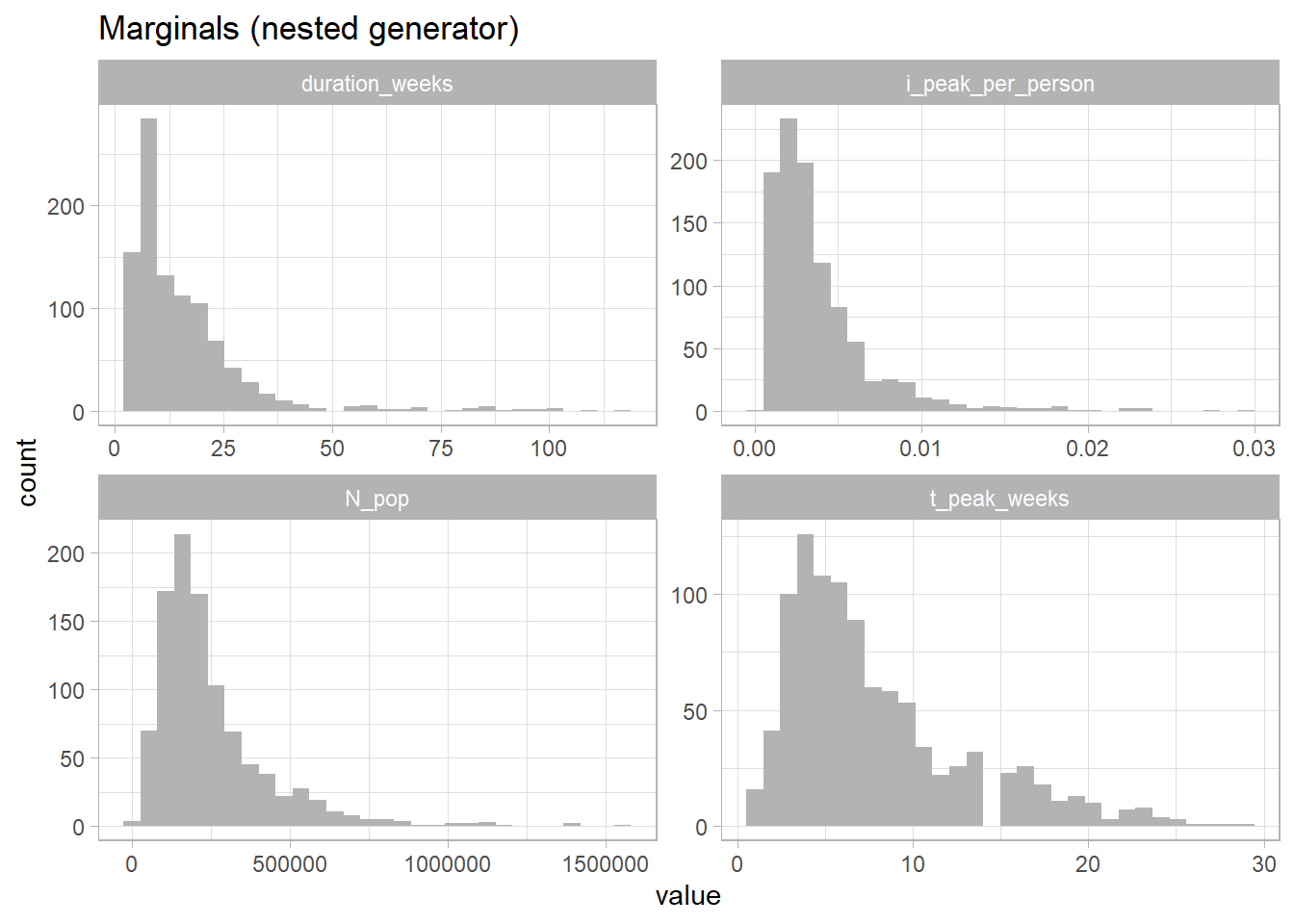 Simulate new outbreaks forward in order (\(\log N\) to \(\log t\) to \(\log D\) to \(\text{logit}(i_\text{peak})\)).