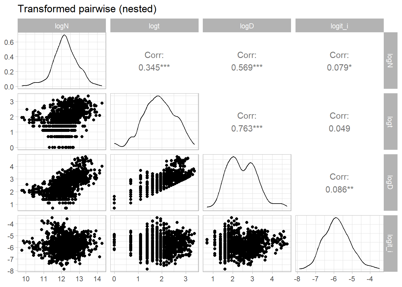 # --- utilities for capturing & rebuilding spline/tensor blocks ---# which columns to keep (finite & non-constant)keep_idx <-function(M) { M <-as.matrix(M)apply(M, 2, function(col) { ok <-all(is.finite(col)); v <-var(col) ok &&is.finite(v) && v >0 })}# build raw bs (with attributes intact) using *safe* dfsafe_df <-function(x, target_df, min_df =2) { nu <-length(unique(x))max(min_df, min(target_df, nu -1))}build_bs_raw <-function(x, target_df) { df_use <-safe_df(x, target_df) splines::bs(x, df = df_use, intercept =FALSE) # returns a "bs" object with attrs}# capture *full* spec: attrs + kept columns + scaling statscapture_bs_spec <-function(bs_obj) { M <-as.matrix(bs_obj) keep <-keep_idx(M)list(degree =attr(bs_obj, "degree"),knots =attr(bs_obj, "knots"),Boundary.knots =attr(bs_obj, "Boundary.knots"),keep = keep,mu =colMeans(M[, keep, drop =FALSE]),sd =apply(M[, keep, drop =FALSE], 2, sd) )}# rebuild a *raw* kept-column bs matrix for new x using the stored attrsbs_raw_from_spec <-function(x_new, spec) { B <- splines::bs(x_new,degree = spec$degree,knots = spec$knots,Boundary.knots = spec$Boundary.knots,intercept =FALSE)as.matrix(B)[, spec$keep, drop =FALSE]}# scale with stored training mu/sd (guard sd=0)scale_with <-function(M, mu, sd) { sd2 <- sd; sd2[!is.finite(sd2) | sd2 ==0] <-1sweep(sweep(as.matrix(M), 2, mu, "-"), 2, sd2, "/")}# column-wise Khatri–Rao producttensor_kr <-function(B1, B2) { out <-vector("list", ncol(B1))for (i inseq_len(ncol(B1))) out[[i]] <- B2 * B1[, i]do.call(cbind, out)}# capture tensor spec from two *raw* kept bases (unscaled)capture_tensor_spec <-function(B1_raw, B2_raw) { Traw <-tensor_kr(B1_raw, B2_raw) keep <-keep_idx(Traw)list(keep = keep,mu =colMeans(Traw[, keep, drop =FALSE]),sd =apply(Traw[, keep, drop =FALSE], 2, sd) )}# Rebuild & scale tensor for new (B1_raw_new, B2_raw_new)tensor_from_spec <-function(B1_raw_new, B2_raw_new, tens_spec) { Traw <-tensor_kr(B1_raw_new, B2_raw_new) Traw <- Traw[, tens_spec$keep, drop =FALSE]scale_with(Traw, tens_spec$mu, tens_spec$sd)}# ---- (RE)CAPTURE SPECS FROM YOUR TRAINING DATA ----# Build RAW bases (with attrs) *before* dropping cols/scalingB_year_N_raw <-build_bs_raw(df$year, 8)B_year_t_raw <-build_bs_raw(df$year, 8)B_year_D_raw <-build_bs_raw(df$year, 8)B_year_I_raw <-build_bs_raw(df$year, 8)B_logt_raw <-build_bs_raw(df$logt, 6)B_logD_raw <-build_bs_raw(df$logD, 6)# capture bs specsspec_year_N <-capture_bs_spec(B_year_N_raw)spec_year_t <-capture_bs_spec(B_year_t_raw)spec_year_D <-capture_bs_spec(B_year_D_raw)spec_year_I <-capture_bs_spec(B_year_I_raw)spec_logt <-capture_bs_spec(B_logt_raw)spec_logD <-capture_bs_spec(B_logD_raw)# capture tensor spec (built from *raw kept* bases)B_logt_keep_raw <-as.matrix(B_logt_raw)[, spec_logt$keep, drop =FALSE]B_logD_keep_raw <-as.matrix(B_logD_raw)[, spec_logD$keep, drop =FALSE]spec_tensor_tD <-capture_tensor_spec(B_logt_keep_raw, B_logD_keep_raw)# store training means/sds for raw covariates used as standardized scalarscenter_sd_cont <-list(logN =c(mu =mean(df$logN), sd =sd(df$logN)),logt =c(mu =mean(df$logt), sd =sd(df$logt)),logD =c(mu =mean(df$logD), sd =sd(df$logD)))
