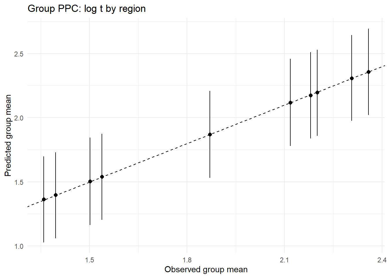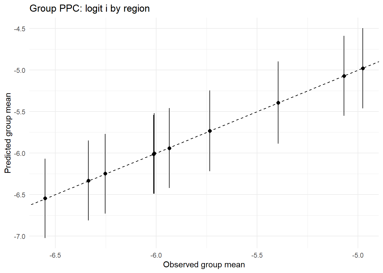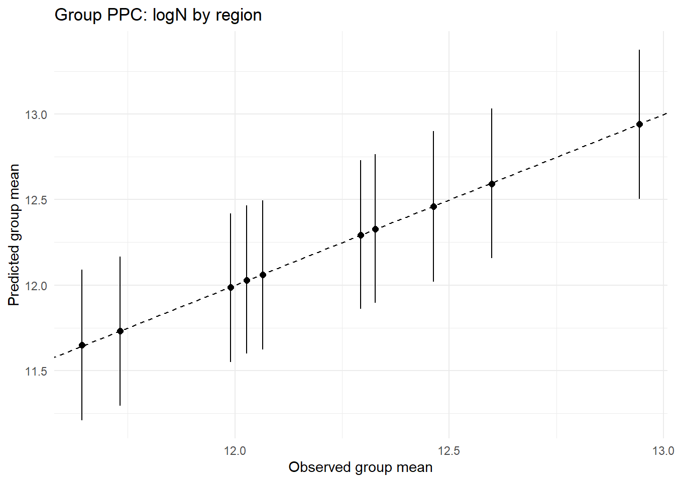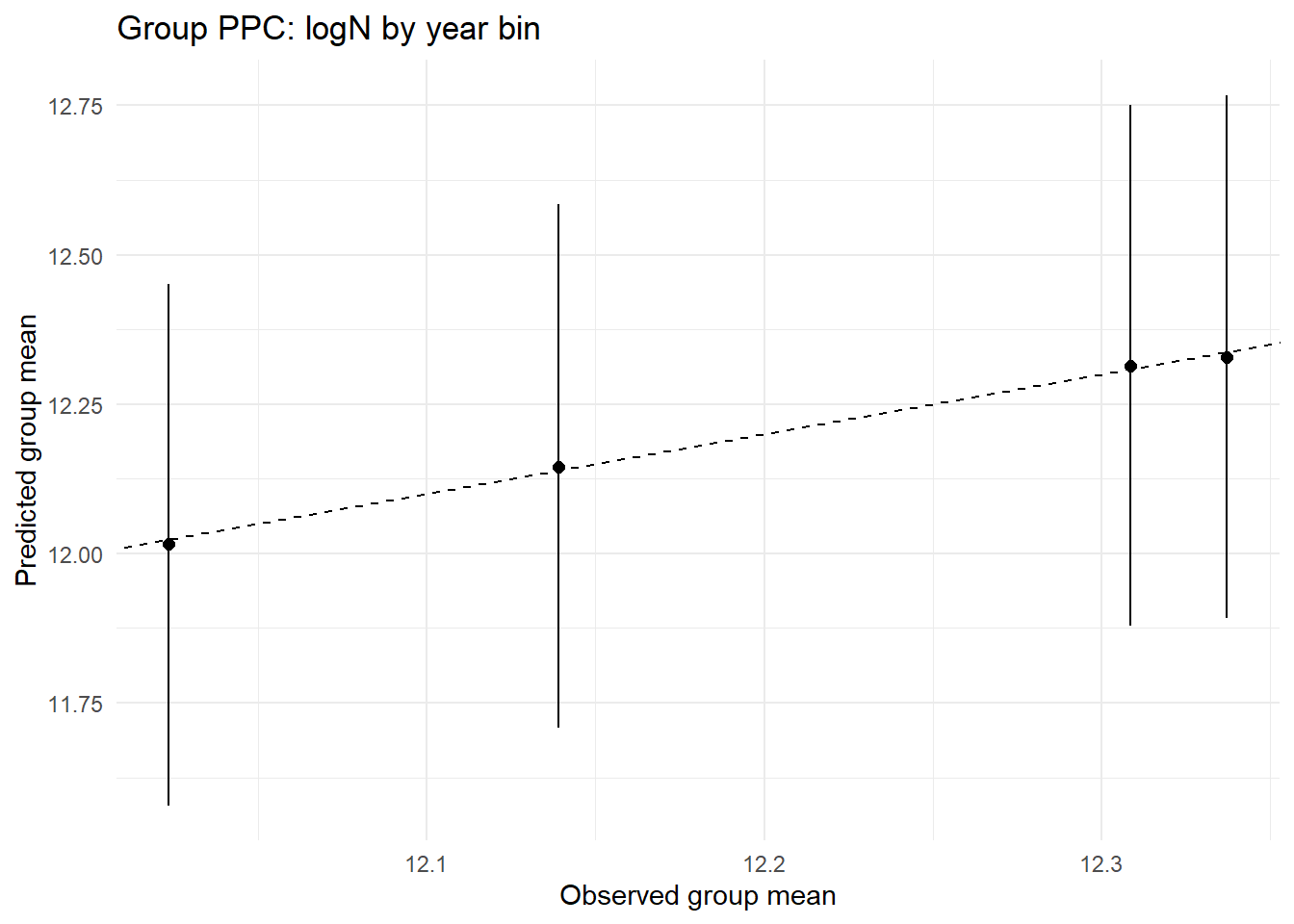 # 6) grouped PPCs (optional): by region or by coarse year bins# useful to spot misfit in subgroupsdf$year_bin <-cut(df$year, breaks =c(-Inf, 2005, 2010, 2015, Inf),labels =c("≤2005","2006–2010","2011–2015","≥2016"), right =TRUE)ppc_by_group <-function(yrep, yobs, group, title) {# compute groupwise observed vs predictive mean with intervals pred_mean <-colMeans(yrep) pred_lo <-apply(yrep, 2, quantile, 0.1) pred_hi <-apply(yrep, 2, quantile, 0.9)tibble(obs = yobs, mean = pred_mean, lo = pred_lo, hi = pred_hi, grp = group) %>%group_by(grp) %>%summarise(obs_mean =mean(obs),pred_mean =mean(mean),pred_lo =mean(lo),pred_hi =mean(hi),.groups ="drop" ) %>%ggplot(aes(x = obs_mean, y = pred_mean)) +geom_abline(slope =1, intercept =0, linetype =2) +geom_errorbar(aes(ymin = pred_lo, ymax = pred_hi), width =0) +geom_point(size =2) +labs(title = title, x ="Observed group mean", y ="Predicted group mean") +theme_minimal()}ppc_by_group(Yreps$logN, Yobs$logN, df$region, "Group PPC: logN by region")