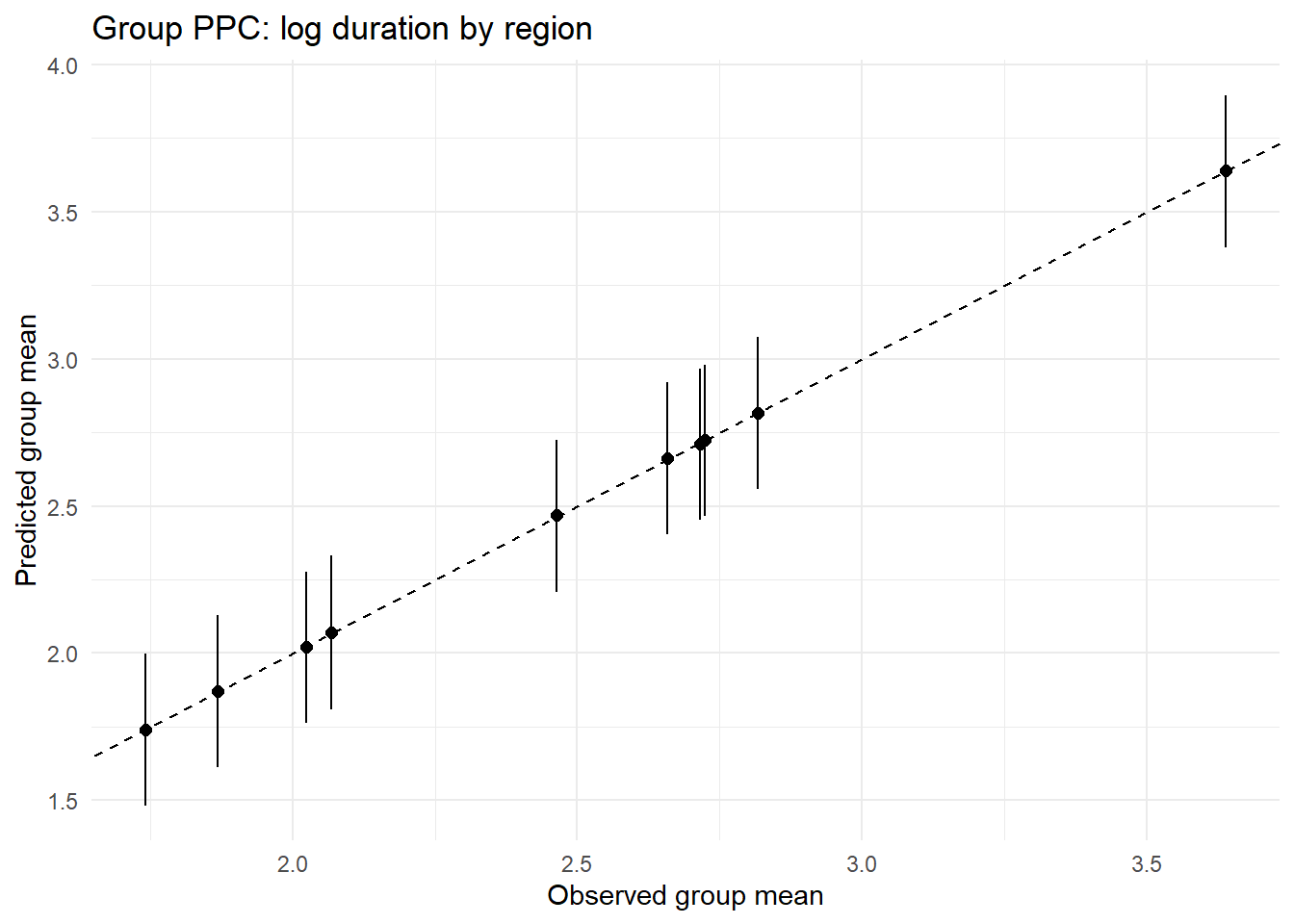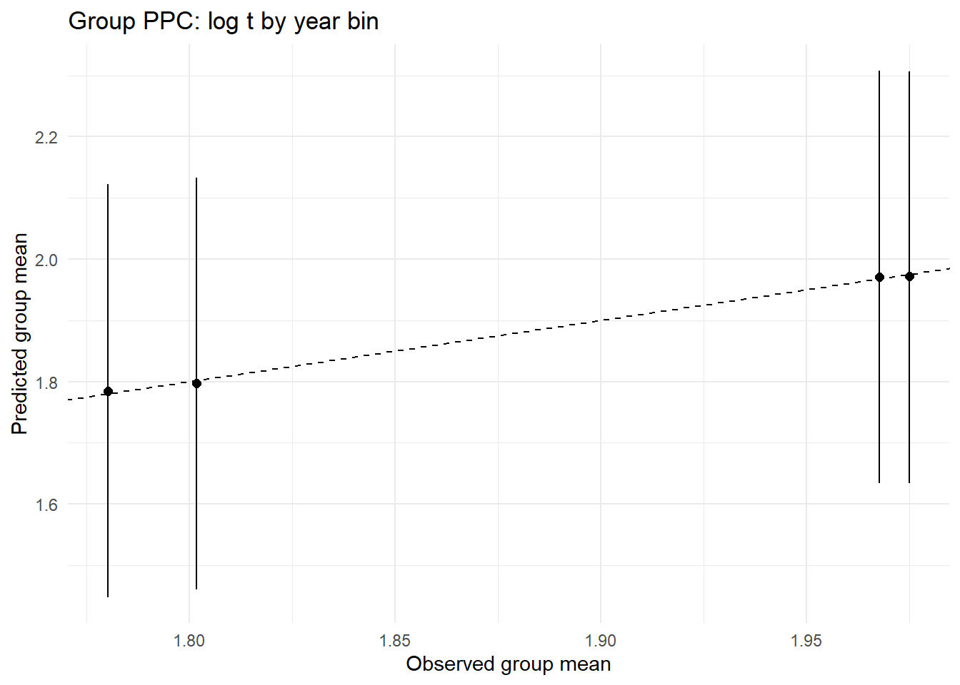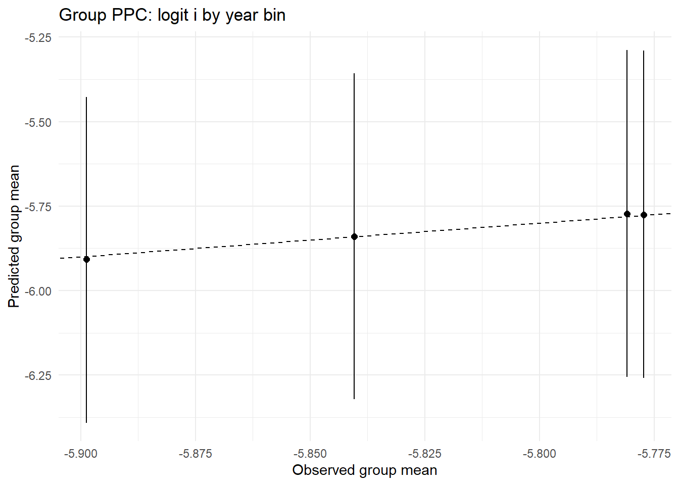 # 6) grouped PPCs (optional): by region or by coarse year bins# useful to spot misfit in subgroupsdf$year_bin <-cut(df$year, breaks =c(-Inf, 2005, 2010, 2015, Inf),labels =c("≤2005","2006–2010","2011–2015","≥2016"), right =TRUE)ppc_by_group <-function(yrep, yobs, group, title) {# compute groupwise observed vs predictive mean with intervals pred_mean <-colMeans(yrep) pred_lo <-apply(yrep, 2, quantile, 0.1) pred_hi <-apply(yrep, 2, quantile, 0.9)tibble(obs = yobs, mean = pred_mean, lo = pred_lo, hi = pred_hi, grp = group) %>%group_by(grp) %>%summarise(obs_mean =mean(obs),pred_mean =mean(mean),pred_lo =mean(lo),pred_hi =mean(hi),.groups ="drop" ) %>%ggplot(aes(x = obs_mean, y = pred_mean)) +geom_abline(slope =1, intercept =0, linetype =2) +geom_errorbar(aes(ymin = pred_lo, ymax = pred_hi), width =0) +geom_point(size =2) +labs(title = title, x ="Observed group mean", y ="Predicted group mean") +theme_minimal()}ppc_by_group(Yreps$logN, Yobs$logN, df$region, "Group PPC: logN by region")