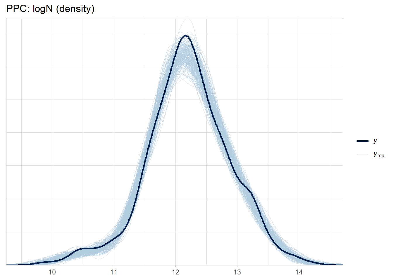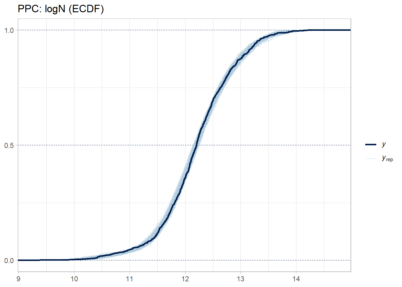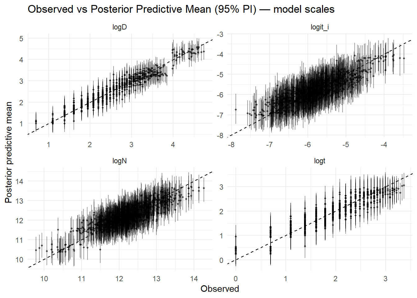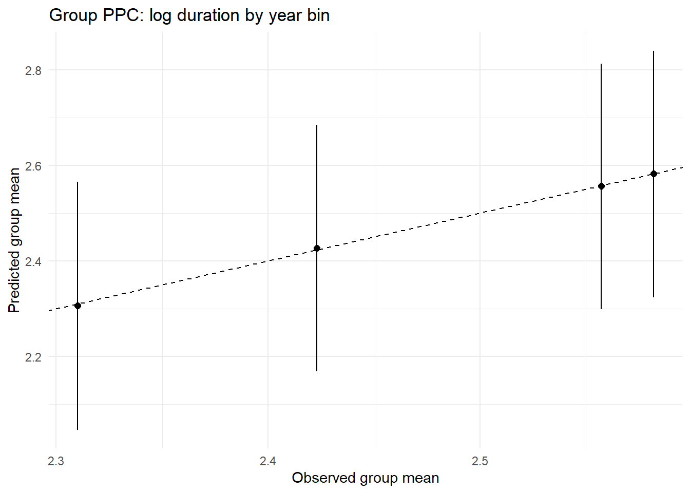 # 6) grouped PPCs (optional): by region or by coarse year bins# useful to spot misfit in subgroupsdf$year_bin <-cut(df$year, breaks =c(-Inf, 2005, 2010, 2015, Inf),labels =c("≤2005","2006–2010","2011–2015","≥2016"), right =TRUE)ppc_by_group <-function(yrep, yobs, group, title) {# compute groupwise observed vs predictive mean with intervals pred_mean <-colMeans(yrep) pred_lo <-apply(yrep, 2, quantile, 0.1) pred_hi <-apply(yrep, 2, quantile, 0.9)tibble(obs = yobs, mean = pred_mean, lo = pred_lo, hi = pred_hi, grp = group) %>%group_by(grp) %>%summarise(obs_mean =mean(obs),pred_mean =mean(mean),pred_lo =mean(lo),pred_hi =mean(hi),.groups ="drop" ) %>%ggplot(aes(x = obs_mean, y = pred_mean)) +geom_abline(slope =1, intercept =0, linetype =2) +geom_errorbar(aes(ymin = pred_lo, ymax = pred_hi), width =0) +geom_point(size =2) +labs(title = title, x ="Observed group mean", y ="Predicted group mean") +theme_minimal()}ppc_by_group(Yreps$logN, Yobs$logN, df$region, "Group PPC: logN by region")