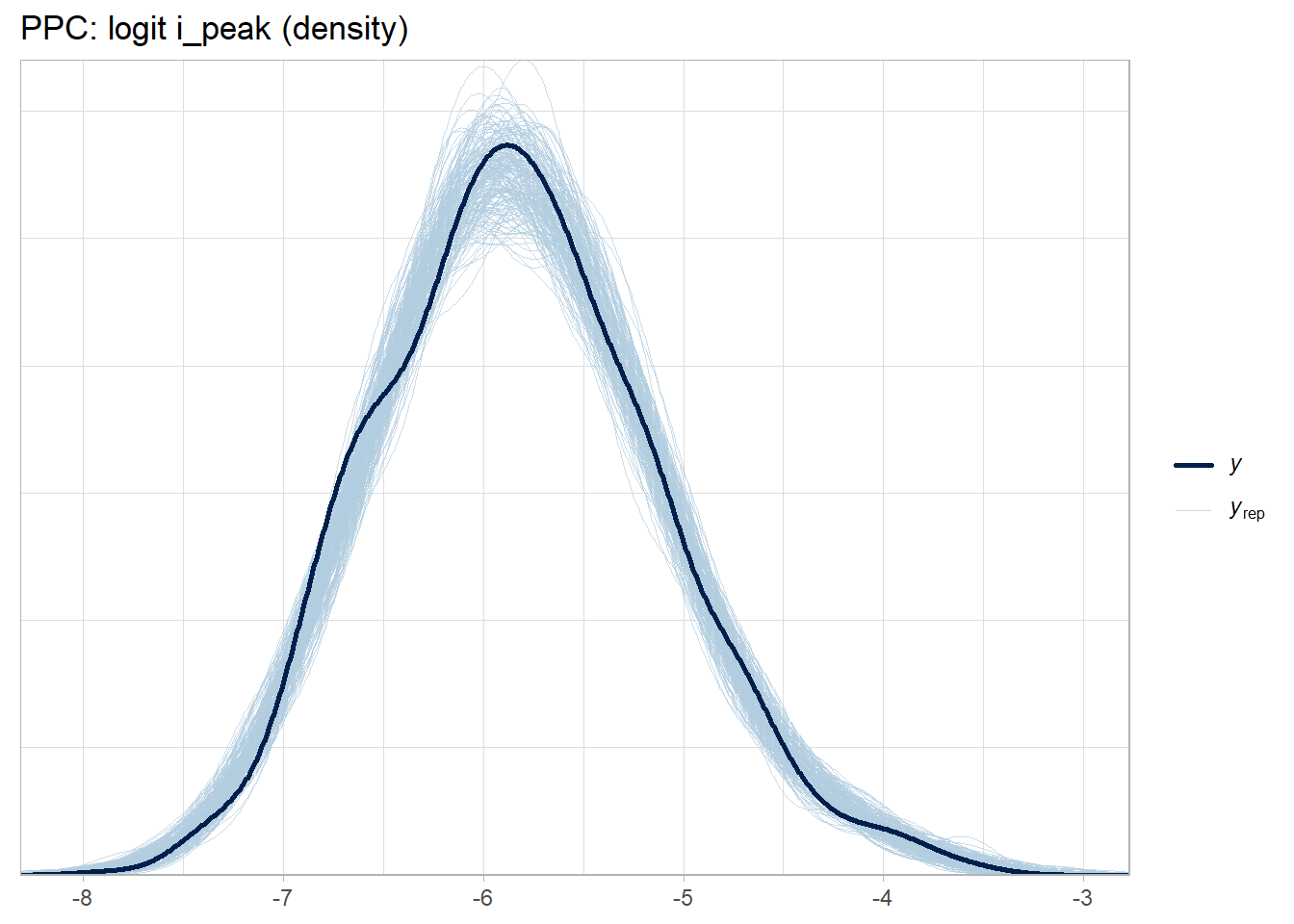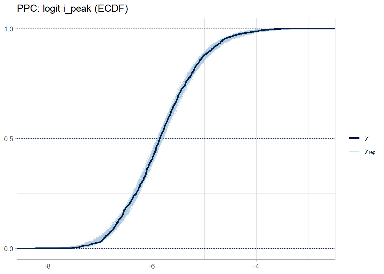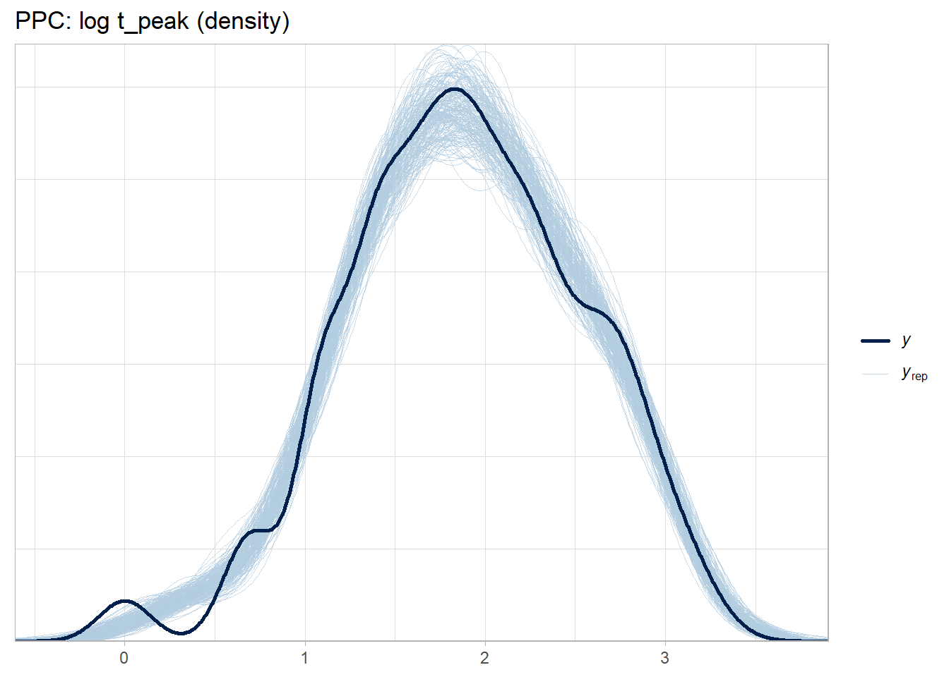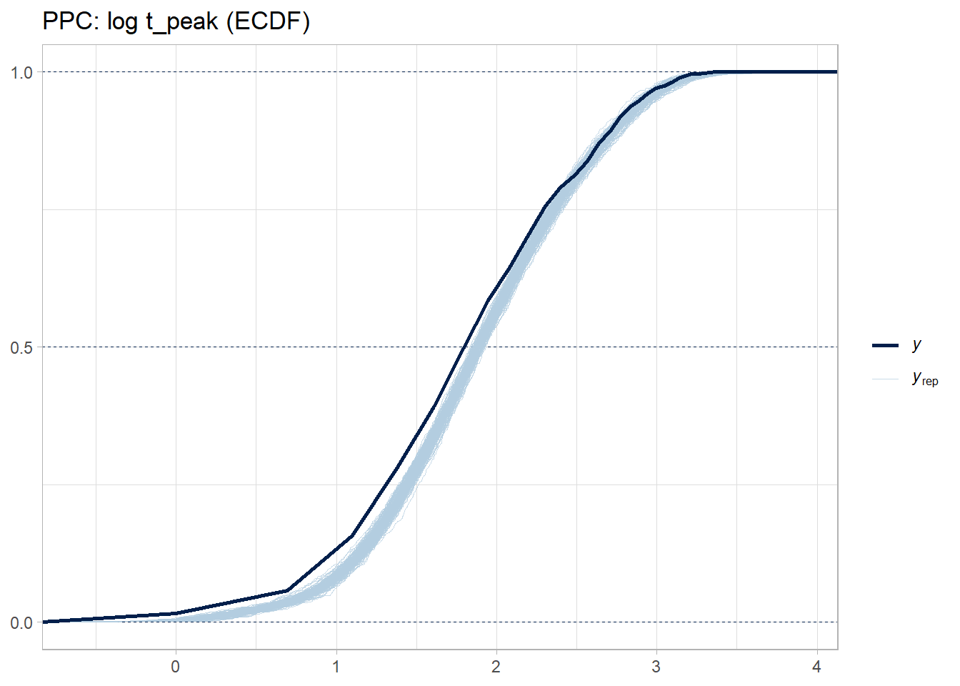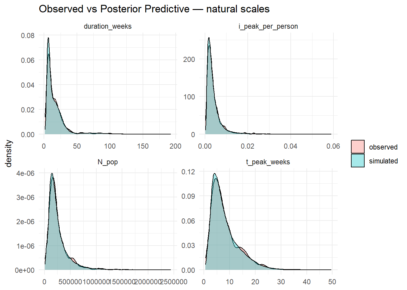 # expect cover80 ≈ 0.8 if intervals are well-calibrated# 5) natural-scale comparisons (histograms/densities)# transform reps to natural scalesinv_logit <-function(x) 1/(1+exp(-x))# pick a small set of draws to avoid memory blow-ups when back-transformingbt_idx <-seq_len(min(100, nrow(yrep_logN)))bt <-list(N_pop =exp(yrep_logN[bt_idx, , drop=FALSE]),t_weeks =exp(yrep_logt[bt_idx, , drop=FALSE]),D_weeks =exp(yrep_logD[bt_idx, , drop=FALSE]),i_peak =inv_logit(yrep_logi[bt_idx, , drop=FALSE]))obs_nat <-list(N_pop =exp(df$logN),t_weeks =exp(df$logt),D_weeks =exp(df$logD),i_peak =inv_logit(df$logit_i))dens_long <-function(mat, label) {tibble(value =as.vector(t(mat)), draw =rep(seq_len(nrow(mat)), each =ncol(mat))) %>%mutate(source ="simulated", var = label)}obs_long <-function(vec, label) tibble(value = vec, source ="observed", var = label)nat_df <-bind_rows(dens_long(bt$N_pop, "N_pop"),dens_long(bt$t_weeks, "t_peak_weeks"),dens_long(bt$D_weeks, "duration_weeks"),dens_long(bt$i_peak, "i_peak_per_person"),obs_long(obs_nat$N_pop, "N_pop"),obs_long(obs_nat$t_weeks, "t_peak_weeks"),obs_long(obs_nat$D_weeks, "duration_weeks"),obs_long(obs_nat$i_peak, "i_peak_per_person"))ggplot(nat_df, aes(value, fill = source)) +geom_density(alpha =0.35) +facet_wrap(~var, scales ="free") +labs(title ="Observed vs Posterior Predictive — natural scales", x =NULL, y ="density", fill =NULL) +theme_minimal()