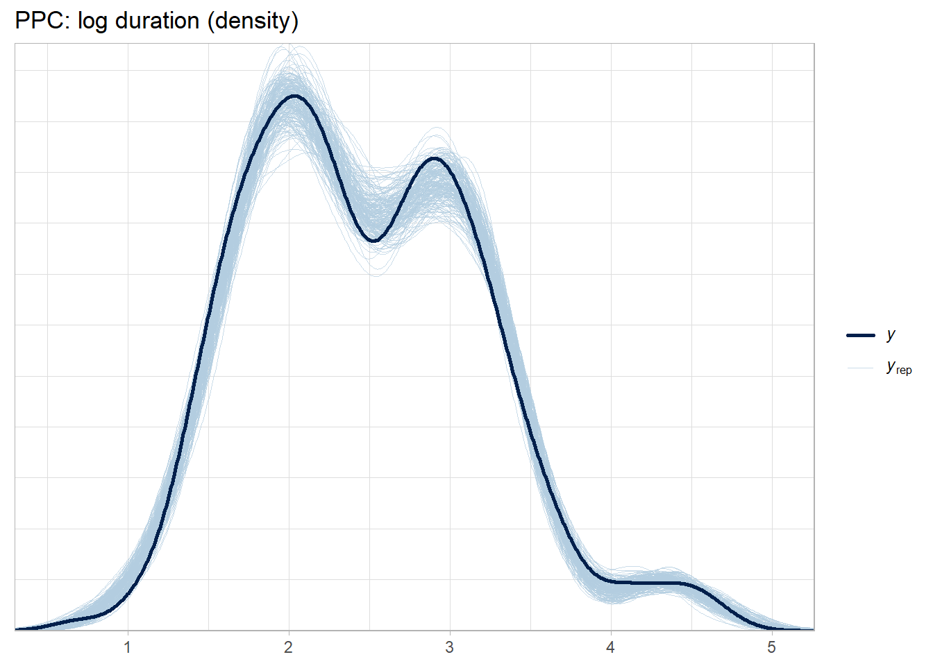 ppc_by_group(Yreps$logD, Yobs$logD, df$year_bin, "Group PPC: log duration by year bin")