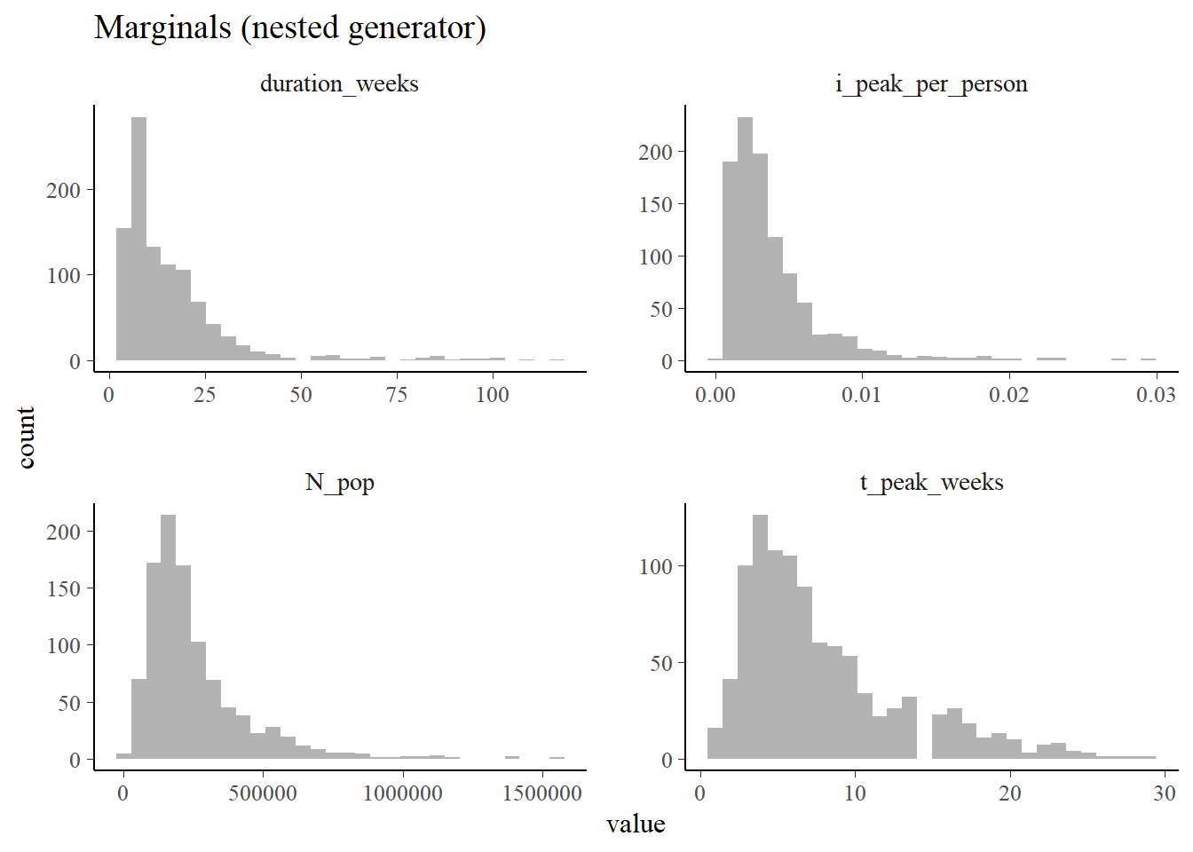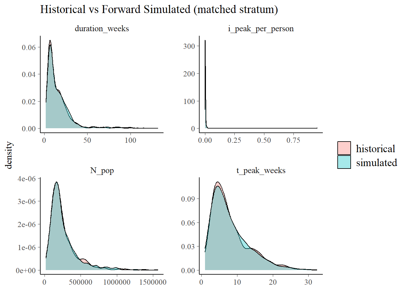 hist_summ <- df %>%# filter(year == 2015, region =="R2", country == "C5") %>% transmute(source ="historical",N_pop =exp(logN),t_peak_weeks =exp(logt),duration_weeks =exp(logD),i_peak_per_person =plogis(logit_i))# sim_summ <- sim1 %>% mutate(source = "simulated")sim_summ <- sim_meta %>%mutate(source ="simulated")bind_rows(hist_summ, sim_summ) %>%pivot_longer(c(N_pop, t_peak_weeks, duration_weeks, i_peak_per_person),names_to ="var", values_to ="value") %>%ggplot(aes(value, fill = source)) +geom_density(alpha =0.35) +facet_wrap(~var, scales ="free") +labs(title ="Historical vs Forward Simulated (matched stratum)",x =NULL, y ="density", fill =NULL)