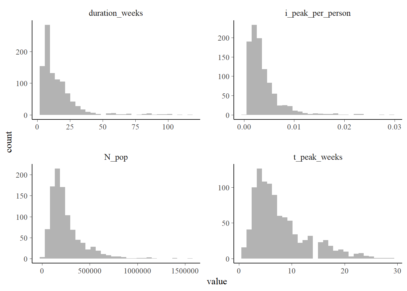 \(N_n\): population size; t_n: time to peak (weeks) \(D_n\): duration (weeks) \(i_n\): peak weekly incidence per person in \((0,1)\)\(y_n\): year \(r_n \in {1,...,R}\): region \(c_n \in {1,...,C}\): country (nested in region)