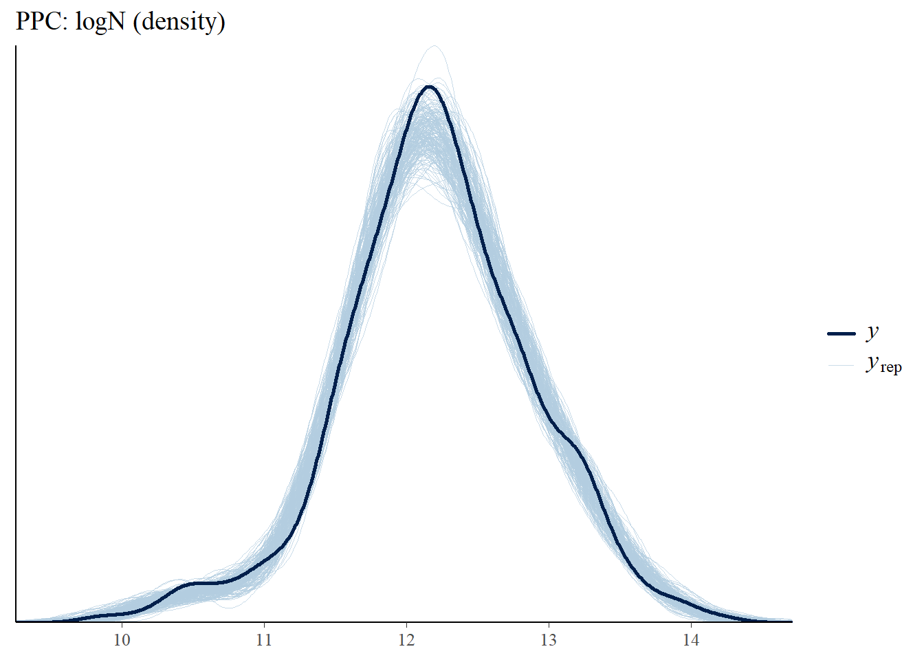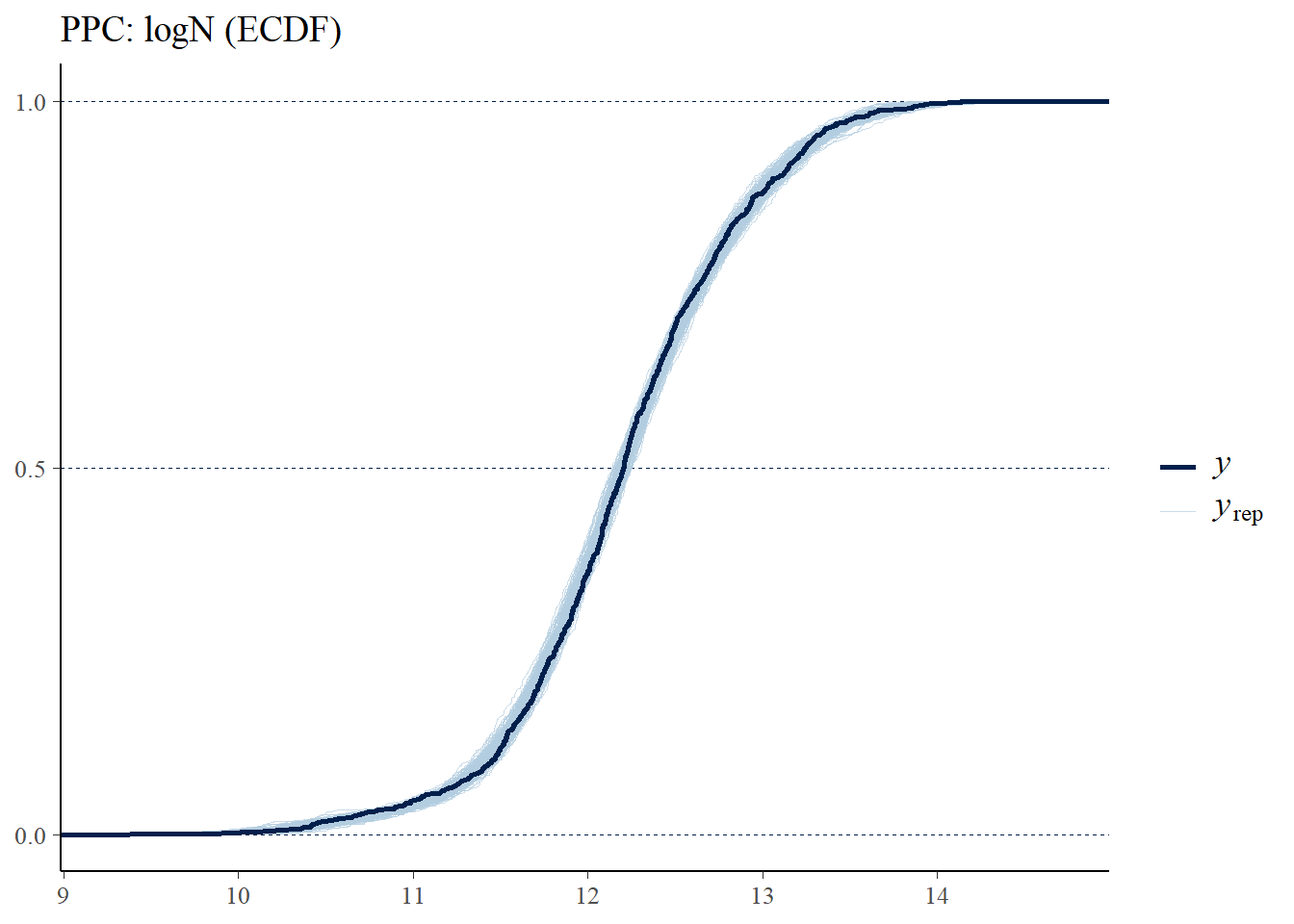 # 6) grouped PPCs (optional): by region or by coarse year bins# useful to spot misfit in subgroupsdf$year_bin <-cut(df$year, breaks =c(-Inf, 2005, 2010, 2015, Inf),labels =c("≤2005","2006–2010","2011–2015","≥2016"), right =TRUE)ppc_by_group <-function(yrep, yobs, group, title) {# compute groupwise observed vs predictive mean with intervals pred_mean <-colMeans(yrep) pred_lo <-apply(yrep, 2, quantile, 0.1) pred_hi <-apply(yrep, 2, quantile, 0.9)tibble(obs = yobs, mean = pred_mean, lo = pred_lo, hi = pred_hi, grp = group) %>%group_by(grp) %>%summarise(obs_mean =mean(obs),pred_mean =mean(mean),pred_lo =mean(lo),pred_hi =mean(hi),.groups ="drop" ) %>%ggplot(aes(x = obs_mean, y = pred_mean)) +geom_abline(slope =1, intercept =0, linetype =2) +geom_errorbar(aes(ymin = pred_lo, ymax = pred_hi), width =0) +geom_point(size =2) +labs(title = title, x ="Observed group mean", y ="Predicted group mean") +theme_minimal()}ppc_by_group(Yreps$logN, Yobs$logN, df$region, "Group PPC: logN by region")