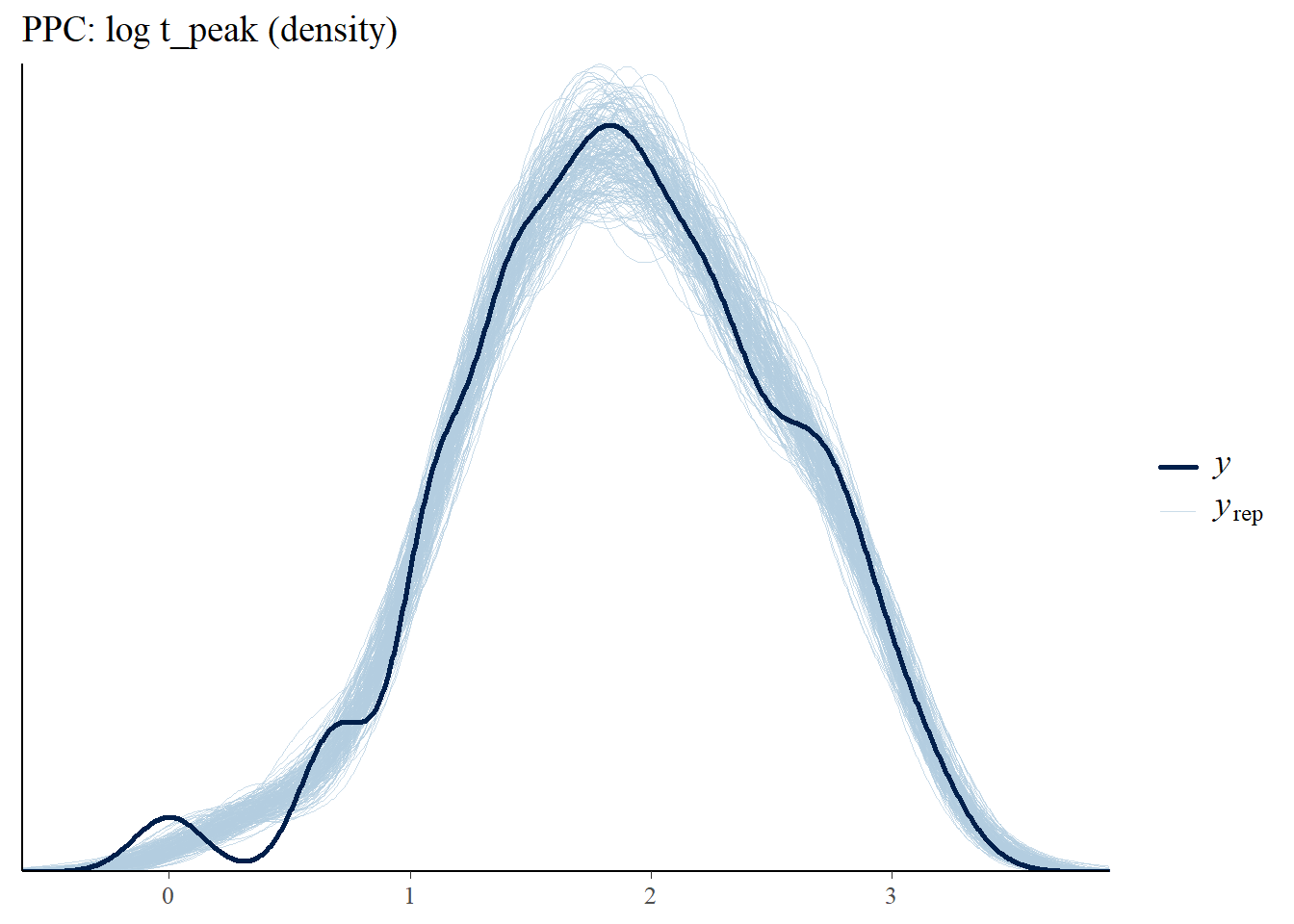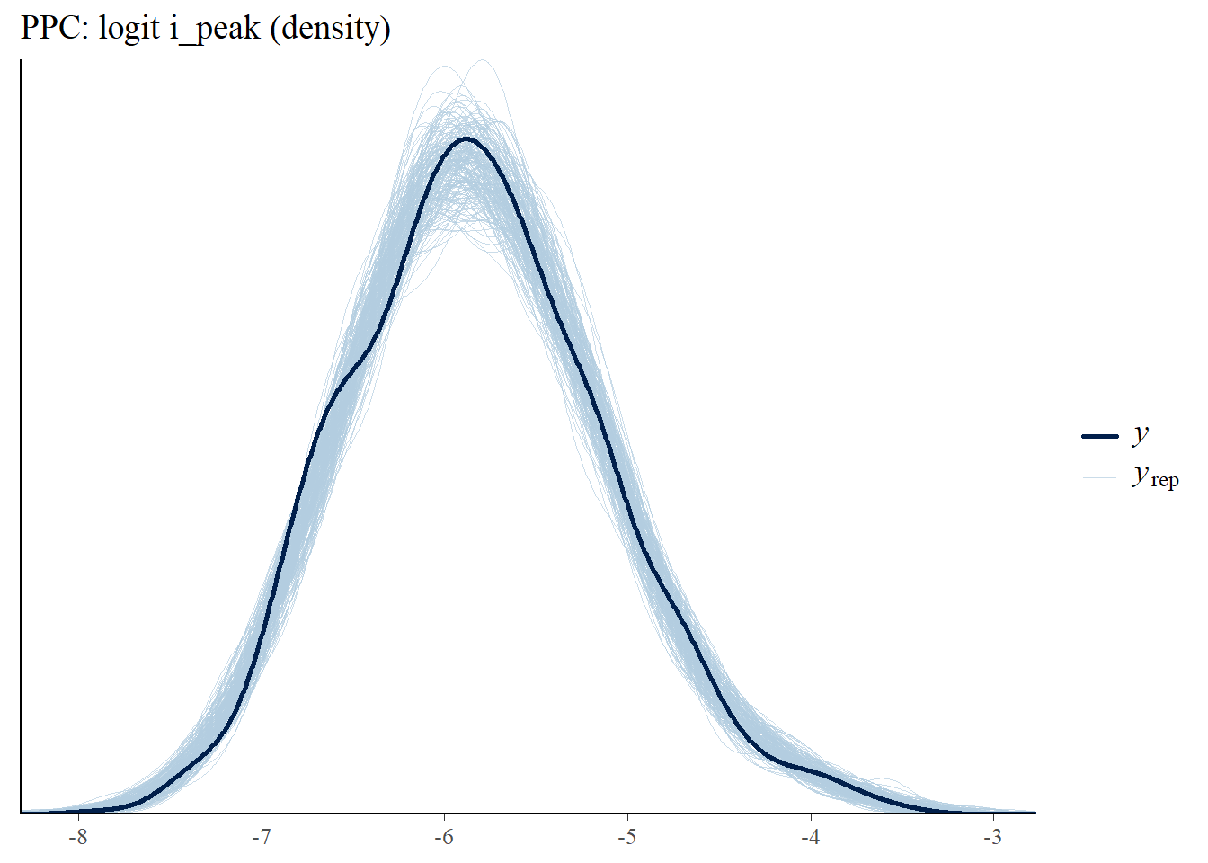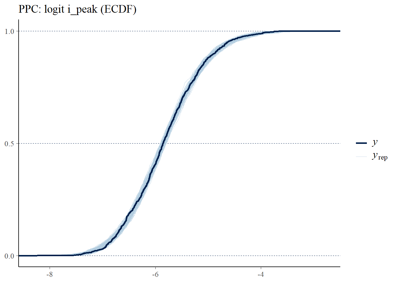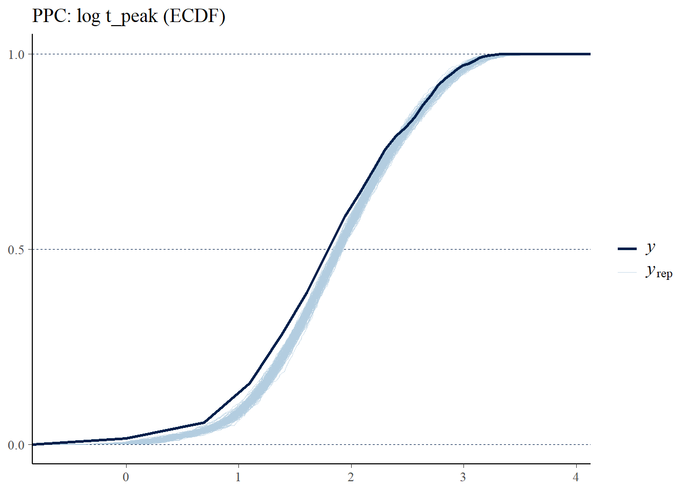 # expect cover80 ≈ 0.8 if intervals are well-calibrated# 5) natural-scale comparisons (histograms/densities)# transform reps to natural scalesinv_logit <-function(x) 1/(1+exp(-x))# pick a small set of draws to avoid memory blow-ups when back-transformingbt_idx <-seq_len(min(100, nrow(yrep_logN)))bt <-list(N_pop =exp(yrep_logN[bt_idx, , drop=FALSE]),t_weeks =exp(yrep_logt[bt_idx, , drop=FALSE]),D_weeks =exp(yrep_logD[bt_idx, , drop=FALSE]),i_peak =inv_logit(yrep_logi[bt_idx, , drop=FALSE]))obs_nat <-list(N_pop =exp(df$logN),t_weeks =exp(df$logt),D_weeks =exp(df$logD),i_peak =inv_logit(df$logit_i))dens_long <-function(mat, label) {tibble(value =as.vector(t(mat)), draw =rep(seq_len(nrow(mat)), each =ncol(mat))) %>%mutate(source ="simulated", var = label)}obs_long <-function(vec, label) tibble(value = vec, source ="observed", var = label)nat_df <-bind_rows(dens_long(bt$N_pop, "N_pop"),dens_long(bt$t_weeks, "t_peak_weeks"),dens_long(bt$D_weeks, "duration_weeks"),dens_long(bt$i_peak, "i_peak_per_person"),obs_long(obs_nat$N_pop, "N_pop"),obs_long(obs_nat$t_weeks, "t_peak_weeks"),obs_long(obs_nat$D_weeks, "duration_weeks"),obs_long(obs_nat$i_peak, "i_peak_per_person"))ggplot(nat_df, aes(value, fill = source)) +geom_density(alpha =0.35) +facet_wrap(~var, scales ="free") +labs(title ="Observed vs Posterior Predictive — natural scales", x =NULL, y ="density", fill =NULL) +theme_minimal()