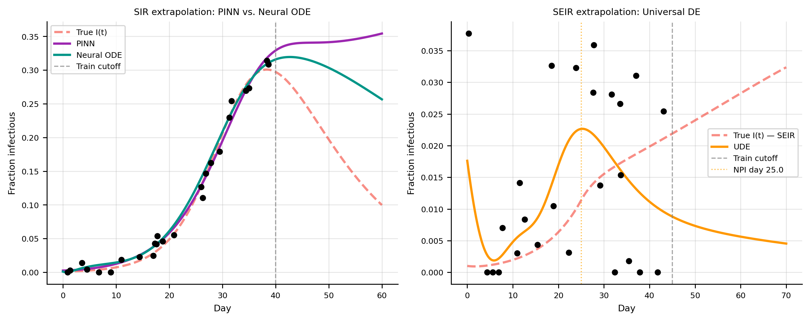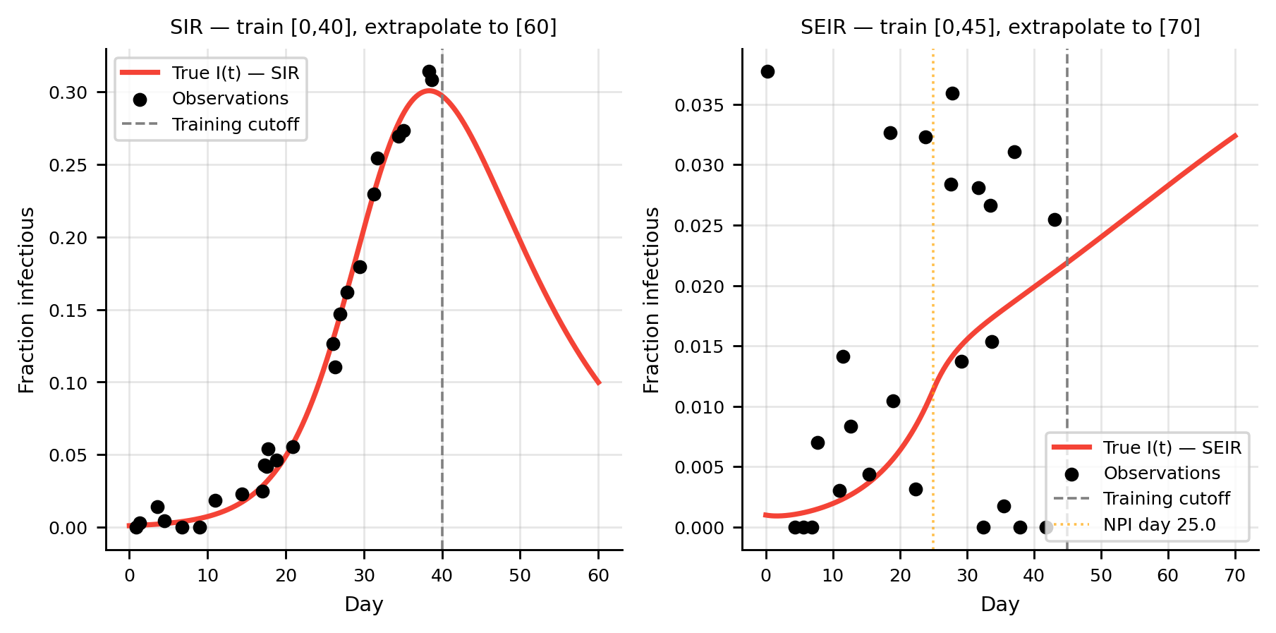 ax.axvline(T_seir_tr, color="gray", lw=1, ls="--", label="Training cutoff")