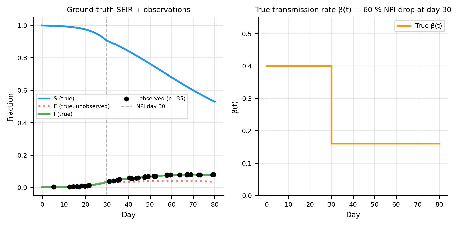 import numpy as npfrom scipy.integrate import odeint as scipy_odeintimport matplotlib.pyplot as pltimport torchimport torch.nn as nntorch.manual_seed(42); np.random.seed(42)plt.rcParams.update({"figure.dpi": 130,"axes.spines.top": False,"axes.spines.right": False,"axes.grid": True,"grid.alpha": 0.3,"font.size": 8,"axes.titlesize": 8,"axes.labelsize": 8,"xtick.labelsize": 7,"ytick.labelsize": 7,"legend.fontsize": 7,})C_S, C_I, C_R ="#2196F3", "#F44336", "#4CAF50"C_OBS, C_PINN ="black", "#9C27B0"C_BETA ="#FF9800"# orange for β(t) curves# ── Ground-truth parameters ────────────────────────────────────────────────────sigma_true =1/5.0# incubation rate (5-day latent period)gamma_true =1/10.0# recovery rate (10-day infectious period)T_max =80.0BETA_HIGH, BETA_LOW, NPI_DAY =0.40, 0.16, 30.0def beta_true(t):"""Step-function NPI: β drops 60 % on day 30."""return BETA_HIGH if t < NPI_DAY else BETA_LOWdef seir_rhs(y, t): s, e, i, r = y b = beta_true(t)return [-b*s*i, b*s*i - sigma_true*e, sigma_true*e - gamma_true*i, gamma_true*i]I0_frac =1e-3y0 = [1- I0_frac, 0.0, I0_frac, 0.0]t_grid = np.linspace(0, T_max, 2000)sol = scipy_odeint(seir_rhs, y0, t_grid)# ── Sparse, noisy observations of I only ──────────────────────────────────────n_obs =35obs_idx = np.sort(np.random.choice(np.arange(10, 2000), n_obs, replace=False))t_obs_np = t_grid[obs_idx]i_clean = sol[obs_idx, 2]noise_sd =0.02* i_clean.max()i_noisy = np.clip(i_clean + np.random.normal(0, noise_sd, n_obs), 0, 1)# ── Plot ───────────────────────────────────────────────────────────────────────fig, axes = plt.subplots(1, 2, figsize=(7, 3.5))ax = axes[0]ax.plot(t_grid, sol[:, 0], color=C_S, lw=2, label="S (true)")ax.plot(t_grid, sol[:, 1], color=C_I, lw=2, ls=":", alpha=0.7, label="E (true, unobserved)")ax.plot(t_grid, sol[:, 2], color=C_R, lw=2, label="I (true)")ax.scatter(t_obs_np, i_noisy, color=C_OBS, s=20, zorder=5, label=f"I observed (n={n_obs})")ax.axvline(NPI_DAY, color="gray", lw=1, ls="--", alpha=0.7, label="NPI day 30")ax.set(xlabel="Day", ylabel="Fraction", title="Ground-truth SEIR + observations")ax.legend(ncol=2, fontsize=6)ax = axes[1]beta_arr = [beta_true(t) for t in t_grid]ax.step(t_grid, beta_arr, where="post", color=C_BETA, lw=2, label="True β(t)")ax.set(xlabel="Day", ylabel="β(t)", title="True transmission rate β(t) — 60 % NPI drop at day 30")ax.set_ylim(0, 0.55)ax.legend()plt.tight_layout(); plt.show()print(f"R₀ (pre-NPI): {BETA_HIGH / gamma_true:.1f}")print(f"R₀ (post-NPI): {BETA_LOW / gamma_true:.1f}")print(f"Peak I: {sol[:, 2].max()*100:.1f}% on day {t_grid[sol[:,2].argmax()]:.0f}")