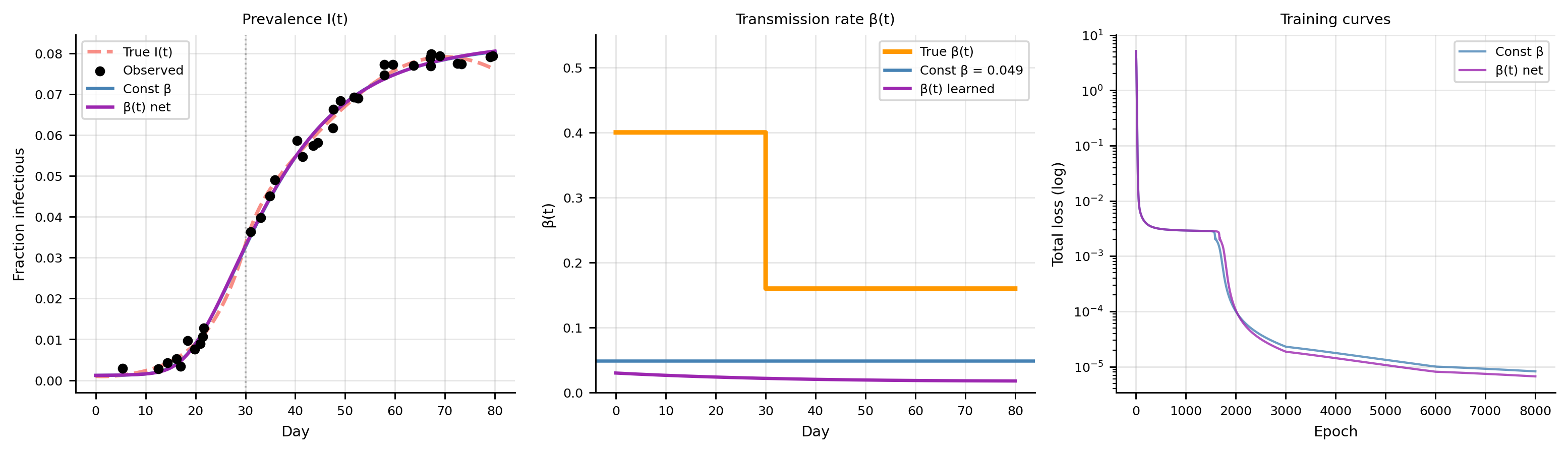 Physics as a regulariser — without the ODE constraint, the \(\beta(t)\) network overfits observation noise; the physics residual enforces a smooth, mechanistically consistent trajectory.