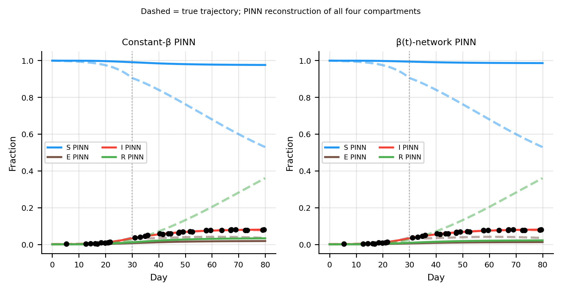 The \(\beta(t)\) PINN recovers all four trajectories including the unobserved \(E\) compartment. The constant-\(\beta\) model underestimates the post-NPI \(I\) decline and overestimates the trough.
