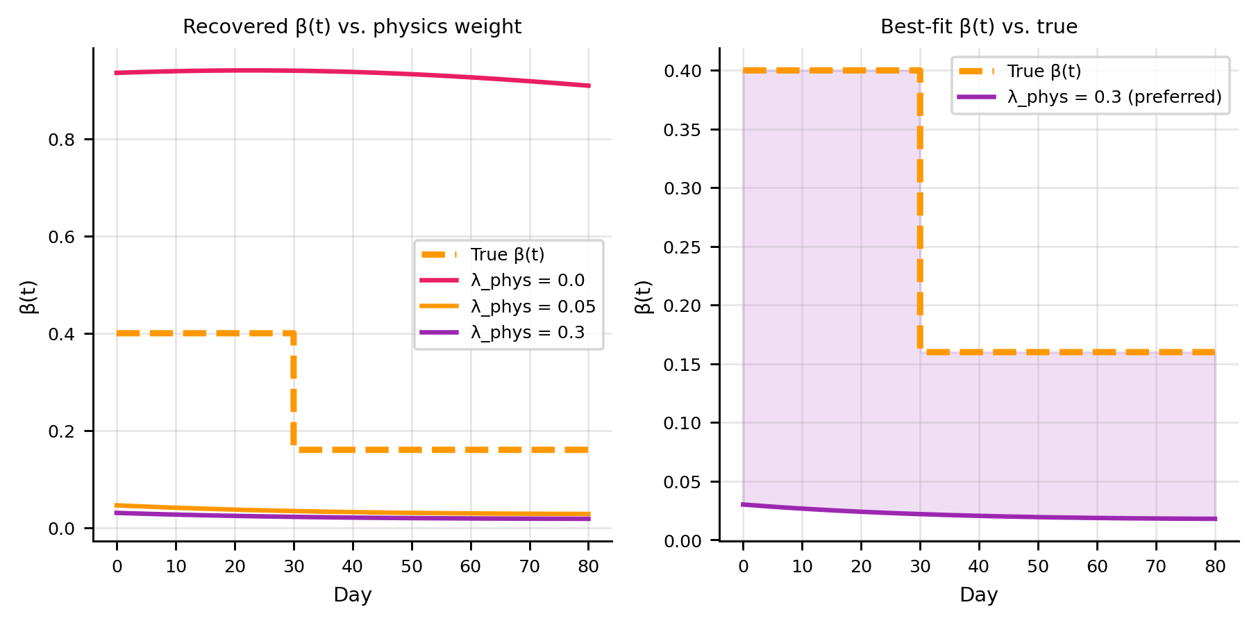 lam_p_values = [0.0, 0.05, 0.3]lam_colors = ["#E91E63", "#FF9800", C_PINN]lam_labels = [f"λ_phys = {v}"for v in lam_p_values]beta_preds = {}for lam_p, col, lab inzip(lam_p_values, lam_colors, lam_labels): torch.manual_seed(42) m = SEIRPINN(learn_beta_t=True) train_seir(m, epochs=8_000, lam_p=lam_p, verbose=False)with torch.no_grad(): beta_preds[lam_p] = m.beta(t_plot).numpy().ravel()fig, axes = plt.subplots(1, 2, figsize=(7, 3.5))ax = axes[0]ax.step(t_grid, [beta_true(t) for t in t_grid], where="post", color=C_BETA, lw=2.5, ls="--", label="True β(t)")for lam_p, col, lab inzip(lam_p_values, lam_colors, lam_labels): ax.plot(t_np, beta_preds[lam_p], color=col, lw=1.8, label=lab)ax.set(xlabel="Day", ylabel="β(t)", title="Recovered β(t) vs. physics weight")ax.legend()ax = axes[1]ax.step(t_grid, [beta_true(t) for t in t_grid], where="post", color=C_BETA, lw=2.5, ls="--", label="True β(t)")lam_opt =0.3ax.plot(t_np, beta_preds[lam_opt], color=C_PINN, lw=1.8, label=f"λ_phys = {lam_opt} (preferred)")ax.fill_between(t_np, np.minimum(beta_preds[lam_opt], [beta_true(t) for t in t_np]), np.maximum(beta_preds[lam_opt], [beta_true(t) for t in t_np]), alpha=0.15, color=C_PINN)ax.set(xlabel="Day", ylabel="β(t)", title="Best-fit β(t) vs. true")ax.legend()plt.tight_layout(); plt.show()