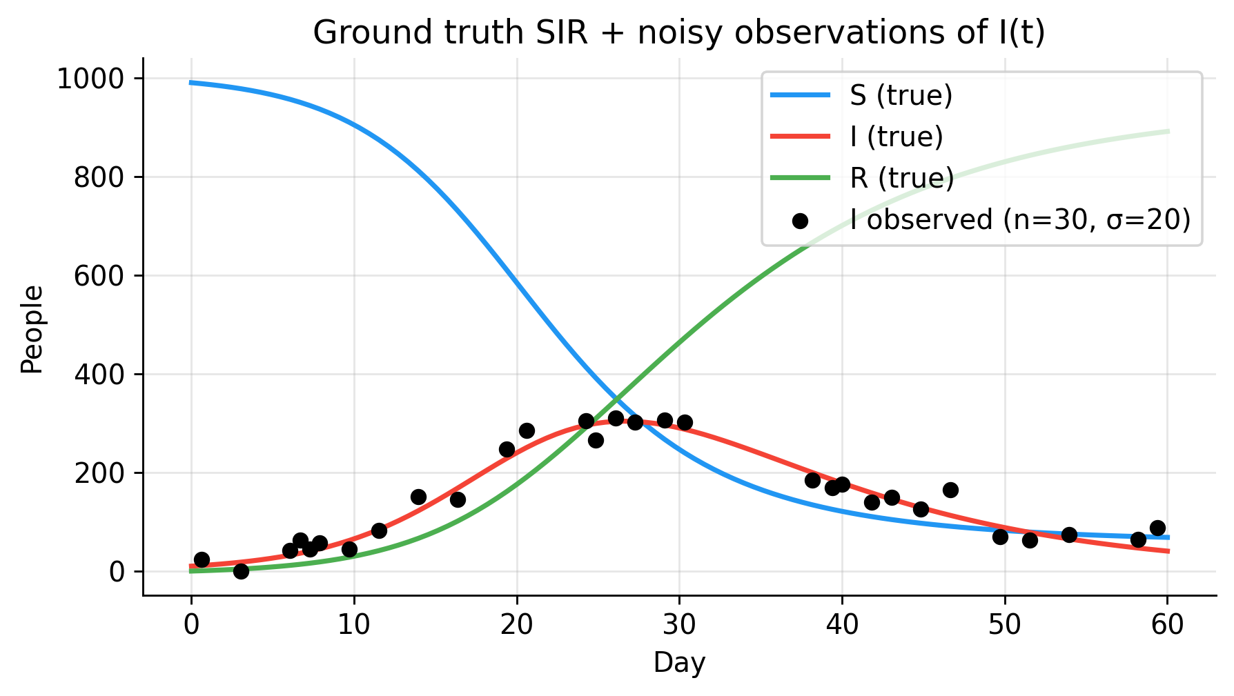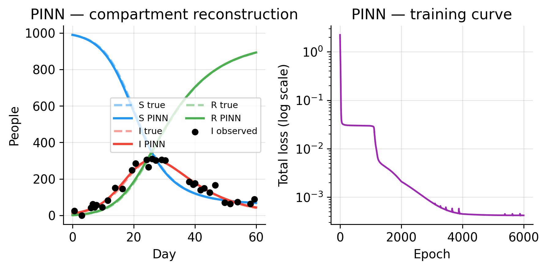 The PINN fits the observed \(I(t)\) points and simultaneouly reconstructs the latent \(S(t)\) and \(R(t)\) trajectories. The physics loss ensures the predicted compartments satisfy the SIR equations everywhere, not only at the observation times.