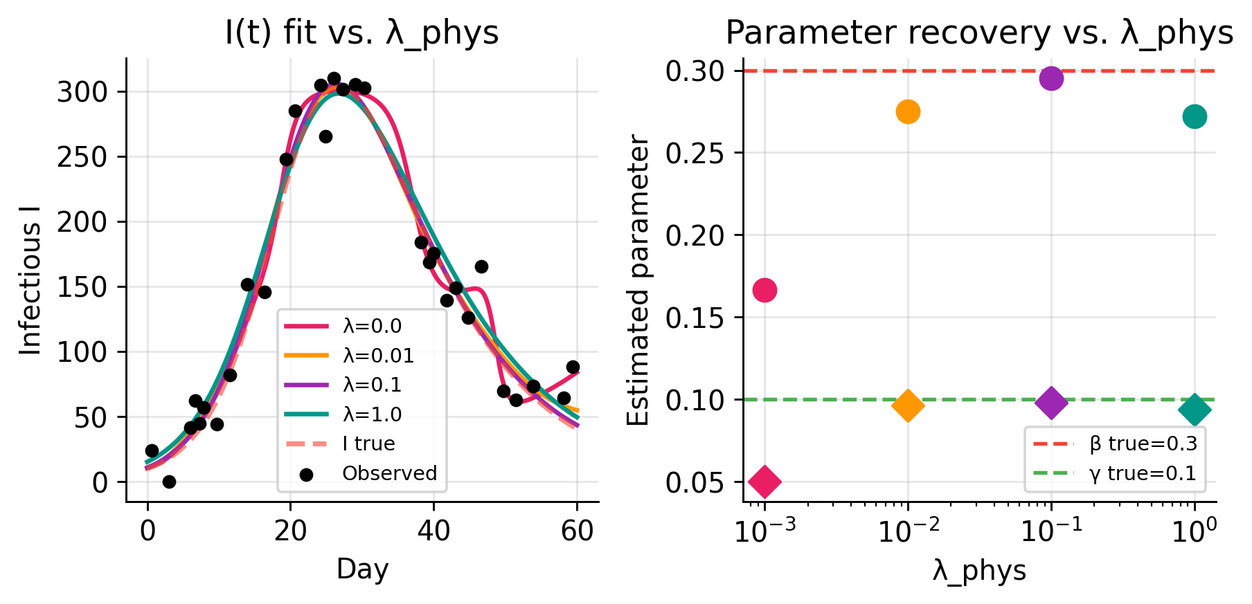 With \(\lambda_\phi = 0\) the network is a pure data-fitting exercise and parameter recovery collapses. Increasing \(\lambda_\phi\) pulls the estimates toward the true values; too large a weight can sacrifice data fit. In practice, \(\lambda_\phi \approx 0.1\) strikes a reasonable balance for this example.