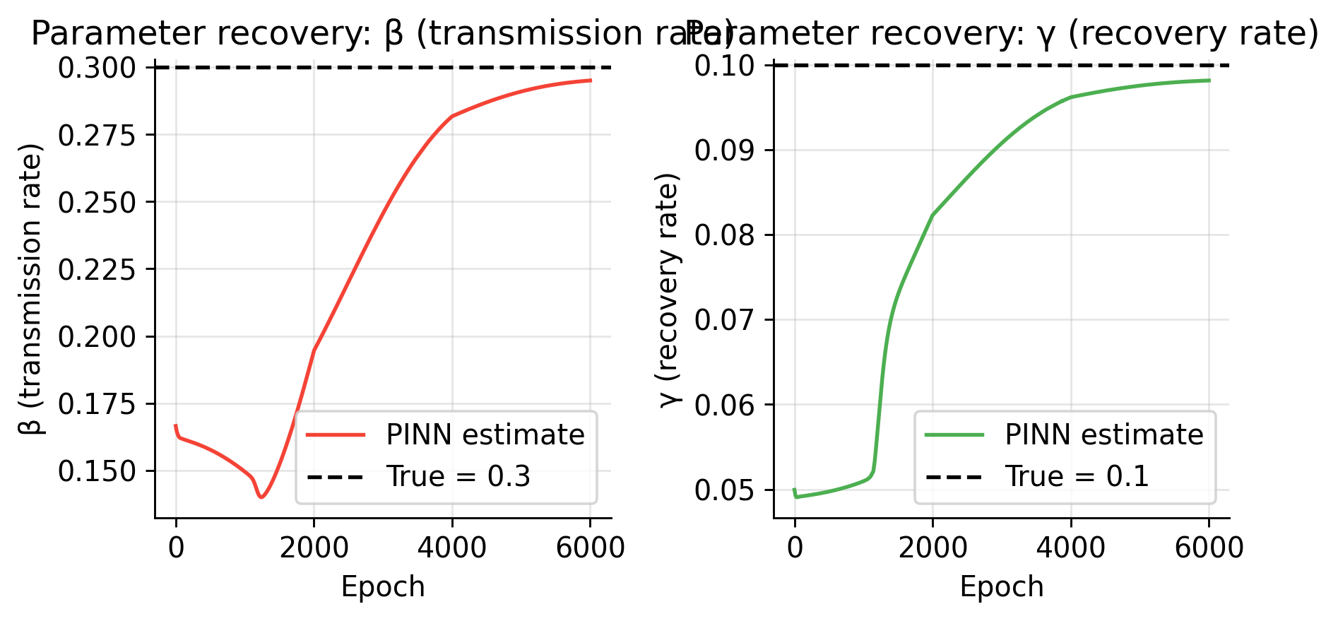 In a COVID-19 application, Linka et al. (3) embedded a SEIR model inside a PINN to estimate time-varying transmission rates from reported case counts across European countries. The physics constraint stabilised parameter recovery even when surveillance data were noisy and incomplete.