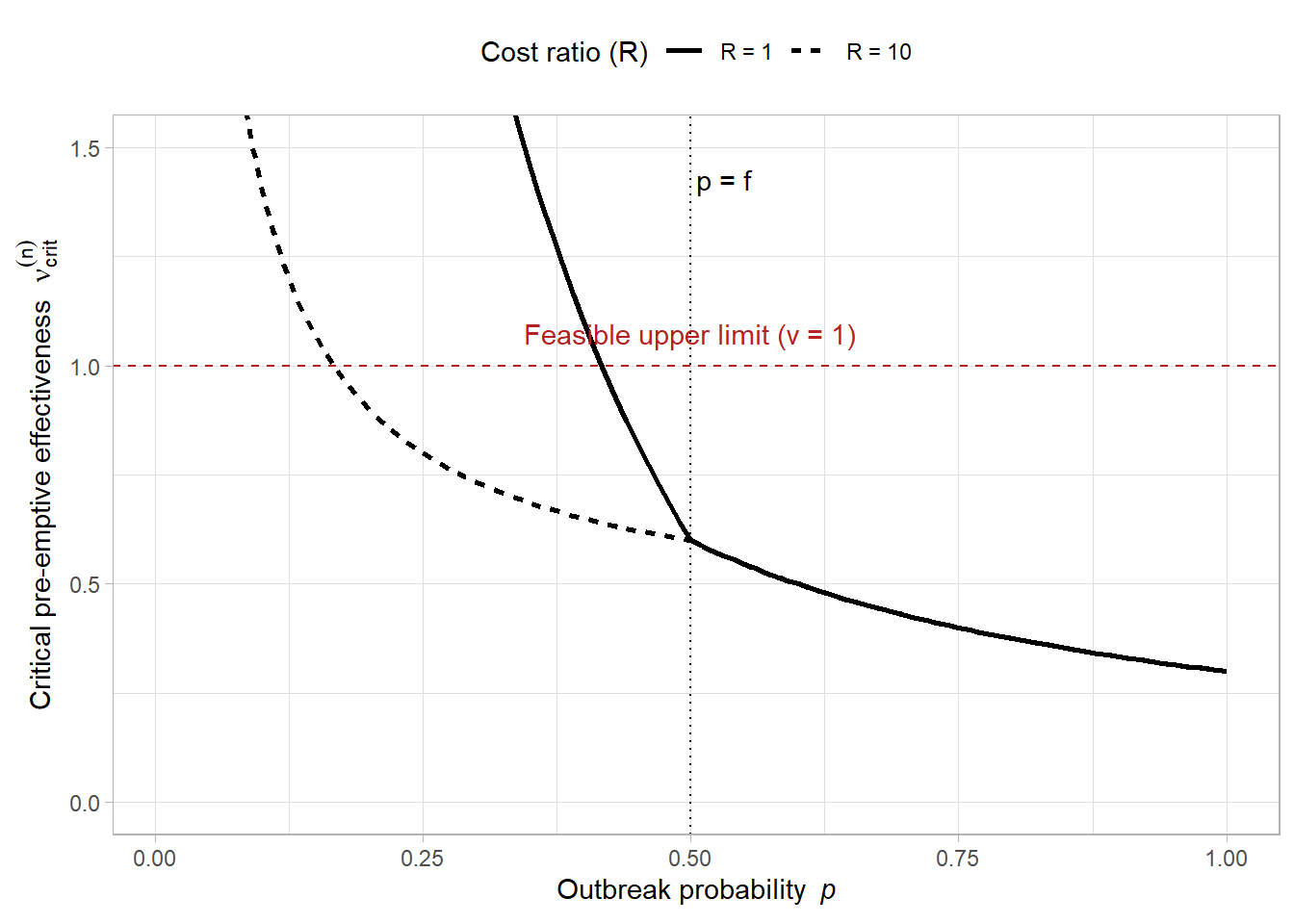 Lines in the plot represent the critical outbreak probability, \(p_{\mathrm{crit}}^{(1)}\), for the respective cost ratio \(R\).