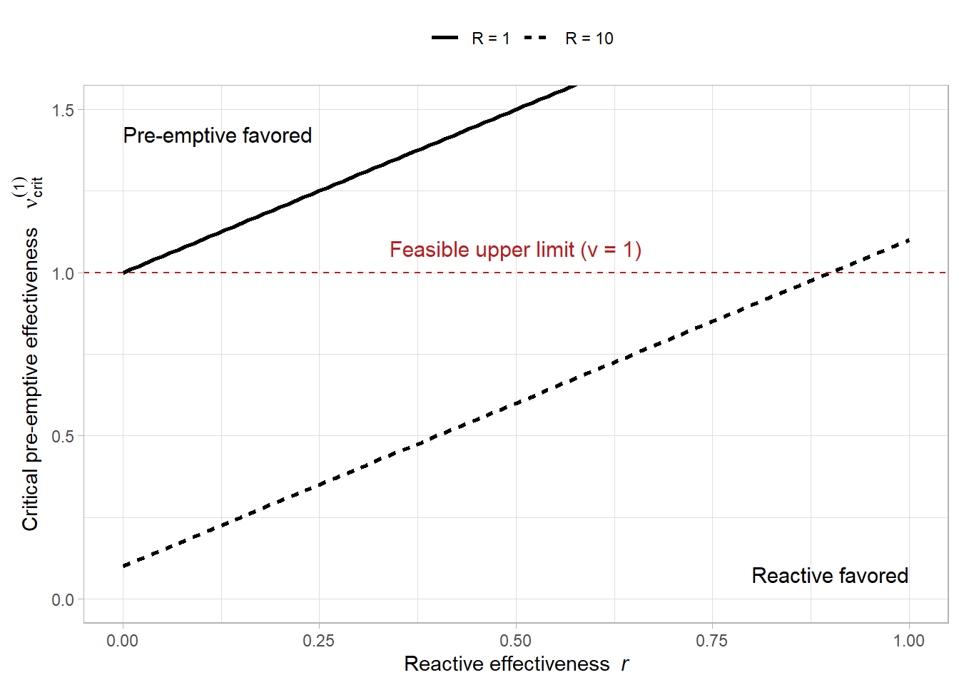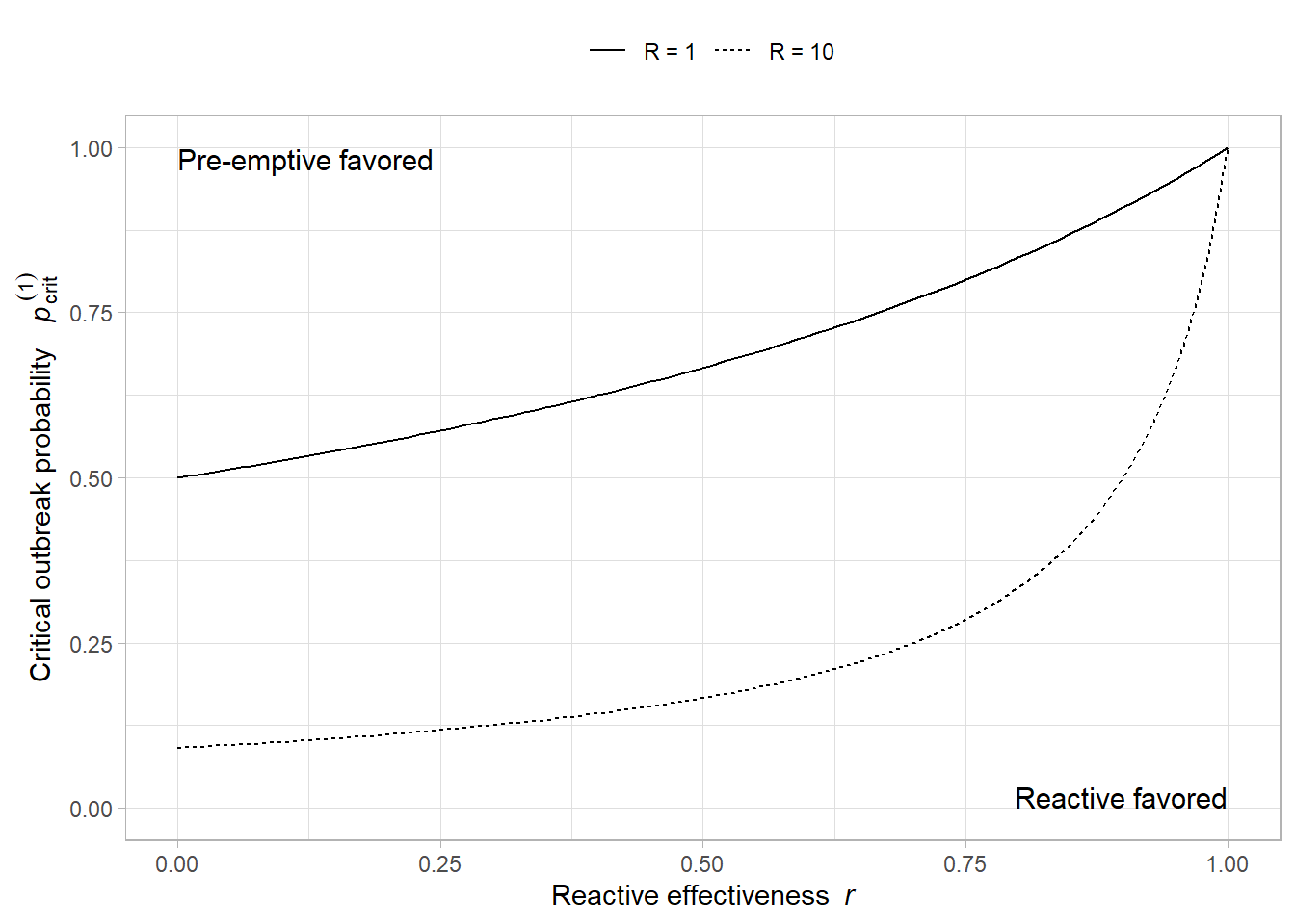 p_vals <-seq(0, 1, 0.01) # mean outbreak probabilityR_vals <-c(1, 10)r_vals <-seq(0, 1, 0.01)data <-expand.grid(r = r_vals, R = R_vals) %>% dplyr::mutate(pstar =p_star_one(R = R, r = r, nu =1),R_label =factor( R,levels =c(1, 10),labels =c("R = 1", "R = 10") ) )# LaTeX labels for xdvir::geom_latex()eq_labels <-c("$c_{\\text{pre}}^{(1)} < c_{\\text{react}}^{(1)}$","$c_{\\text{pre}}^{(1)} > c_{\\text{react}}^{(1)}$")pcrit_labels <-c("$p_{\\text{crit}}^{(1)}(R=1)$","$p_{\\text{crit}}^{(1)}(R=10)$")plt <-ggplot(data, aes(x = r, y = pstar, linetype = R_label)) +geom_line() +# geom_abline(# slope = 1, intercept = 0,# linetype = "dotted",# linewidth = 1,# color = "firebrick"# ) +labs(x =expression("Reactive effectiveness "~italic(r)),y =expression("Critical outbreak probability "~italic(p)[crit]^(1)) ) +theme_light() +theme(legend.position ="top") +# Existing text labelsannotate("text",size =4, x =0, y =1,hjust =0, vjust =1,label ="Pre-emptive favored" ) +annotate("text",size =4, x =1, y =0,hjust =1, vjust =0,label ="Reactive favored" ) +annotate("latex",x =0, y =0.93,label = eq_labels[1],size =4, hjust =0, vjust =1 ) +annotate("latex",x =1, y =0.07,label = eq_labels[2],size =4, hjust =1, vjust =0 ) +annotate("latex",x =0.62, y =0.74,label = pcrit_labels[1],size =4, hjust =1, vjust =0 ) +annotate("latex",x =0.62, y =0.22,label = pcrit_labels[2],size =4, hjust =1, vjust =0 ) +scale_linetype_discrete("")plt