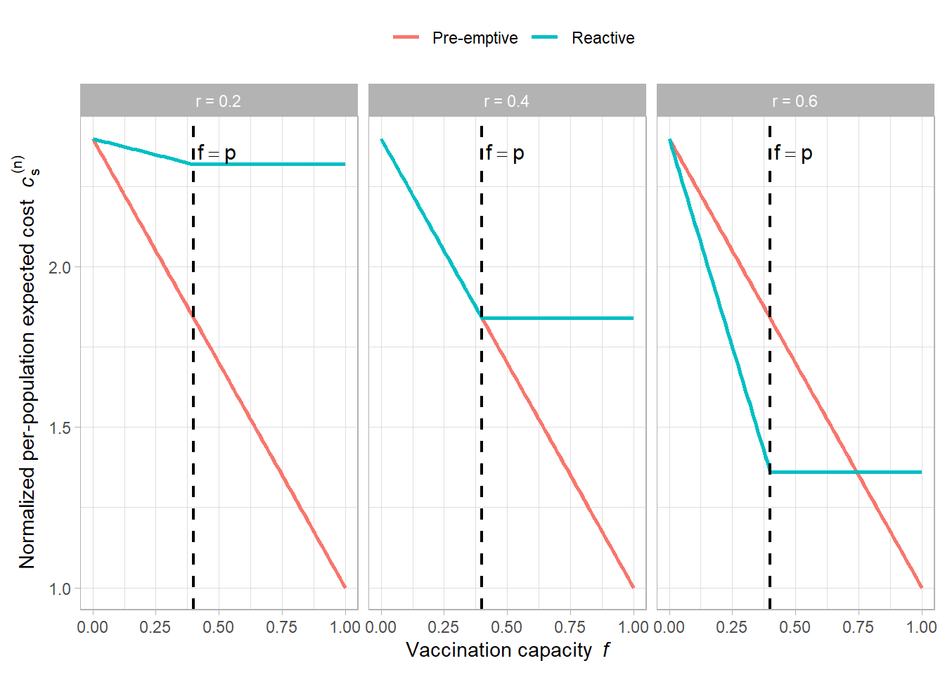 Vaccination capacity is limited (\(f < p\)) and the reactive effectiveness is greater than pre-emptive effectiveness discounted by risk (i.e., \(r > p\nu\)).